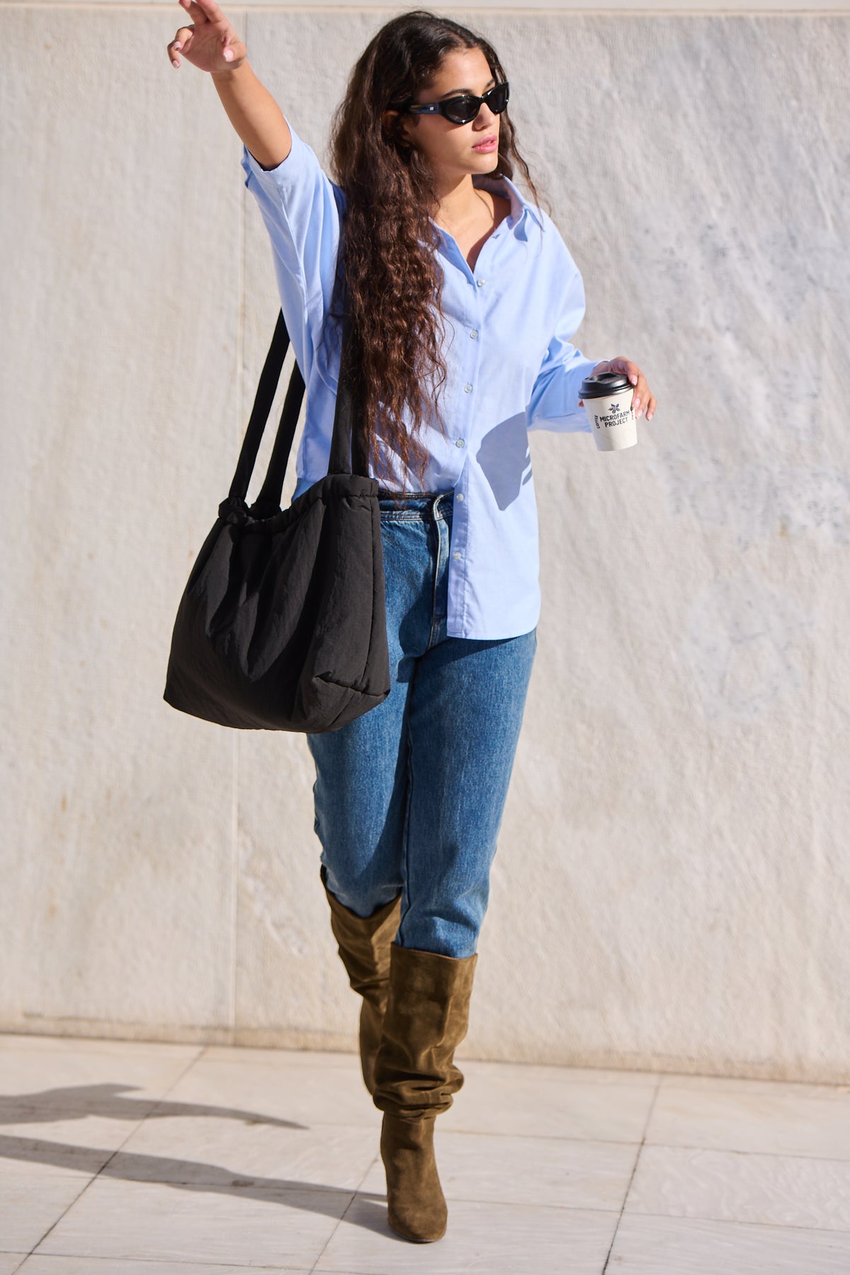 Daniela porte le chemise Cally bleue ciel et le jean Paolo.