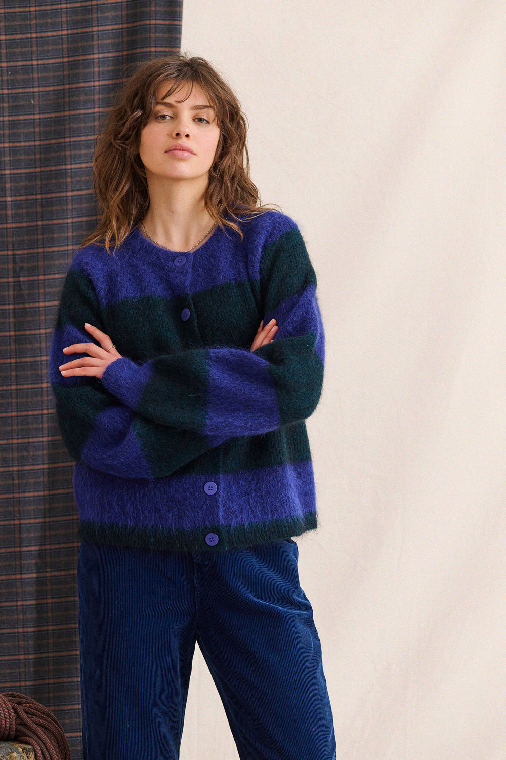 Ce gilet en maille douce joue à fond la carte du style : oversize juste ce qu’il faut, larges rayures lumineuses, et une coupe pensée pour se retourner. Porté boutonné devant ou dans le dos, il change de vibe sans jamais perdre en allure.