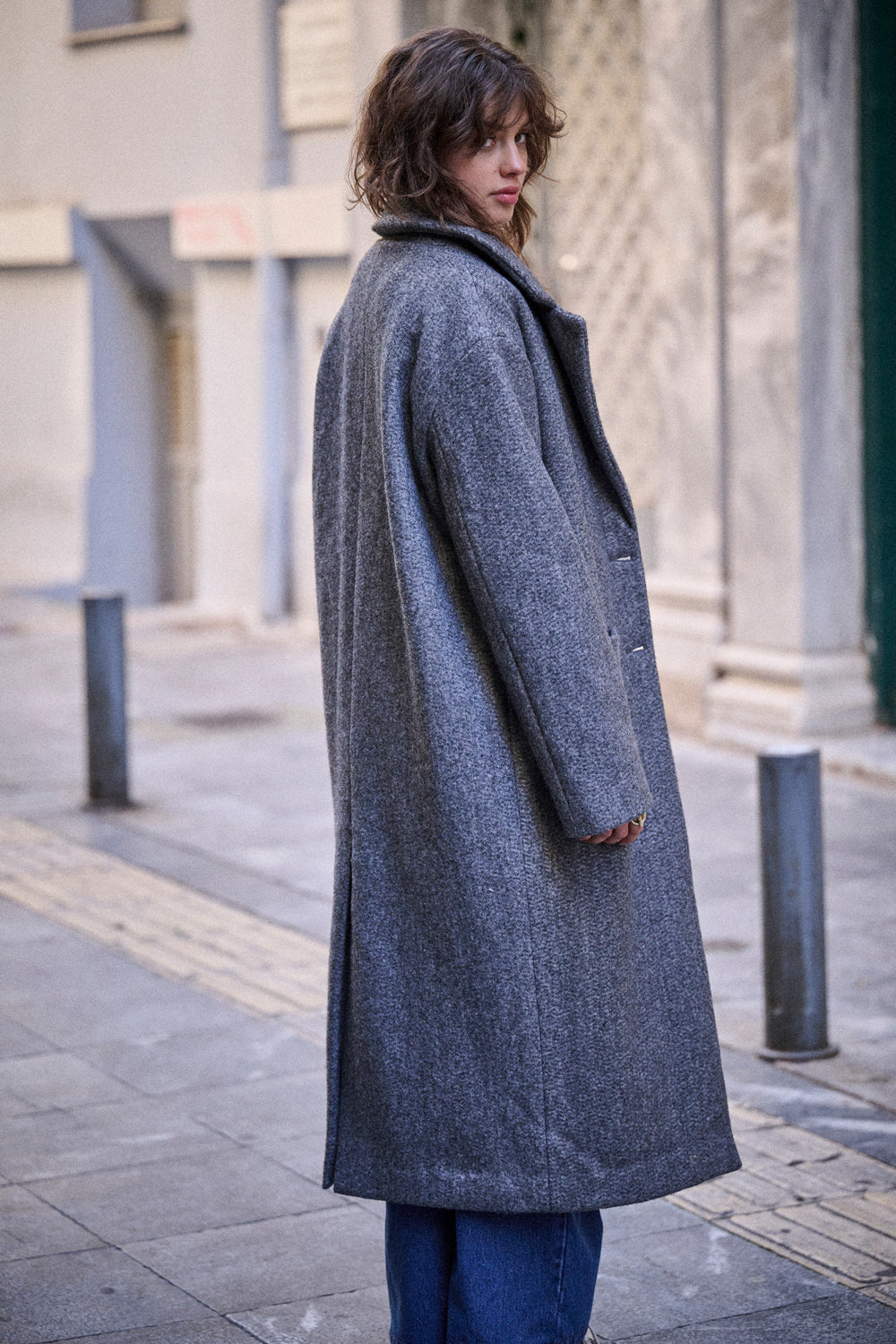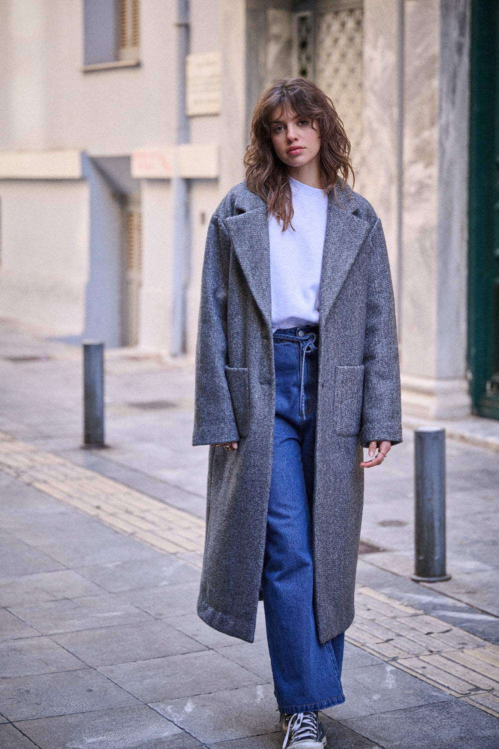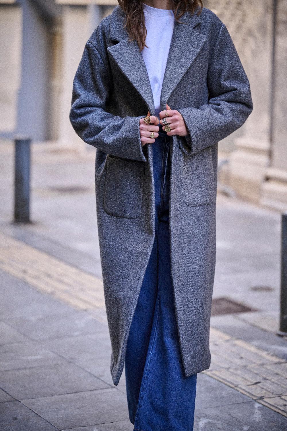 Le manteau long gris qui traverse les saisons sans jamais se démoder. Sa coupe droite et oversize lui donne une allure cool et affirmée, tout en restant facile à superposer sur un jean ou une jupe.