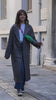 Laure a choisi une doublure rayée contrastée, un détail qu’on aperçoit au mouvement et qui rend ce manteau unique.