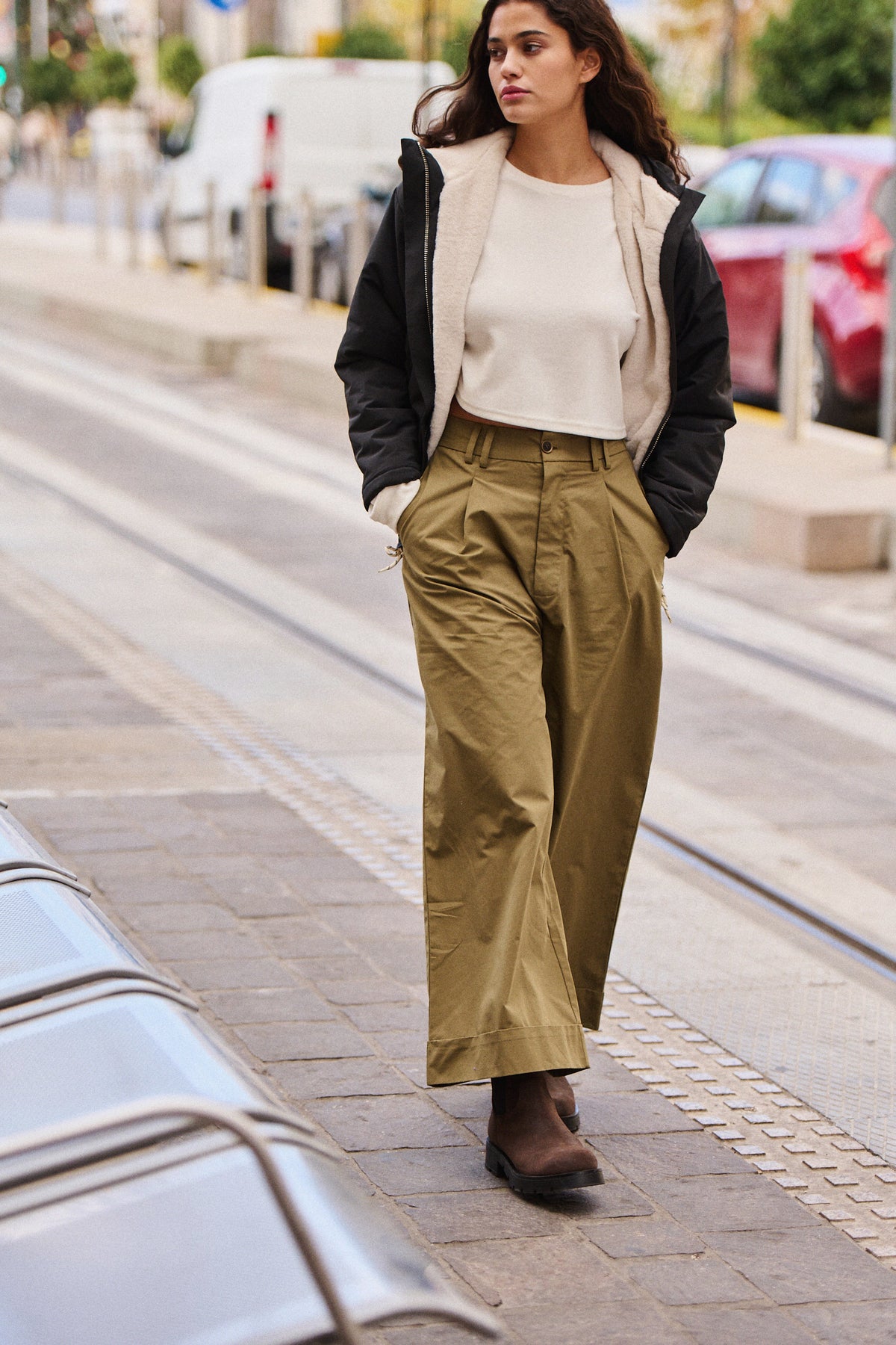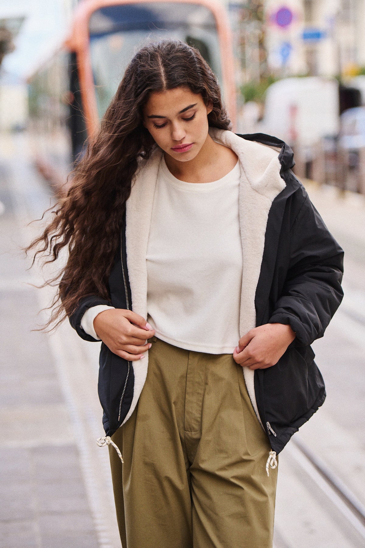 Elle porte la parka Guzmania noire et le pantalon Pol kaki.