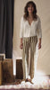 Vous l’avez adoré en version brodée… le voici décliné en rayures ! Ce pantalon reprend la même coupe large et cool, mais se réinvente dans un motif vertical olive et écru qui allonge la silhouette et apporte une vraie touche graphique.