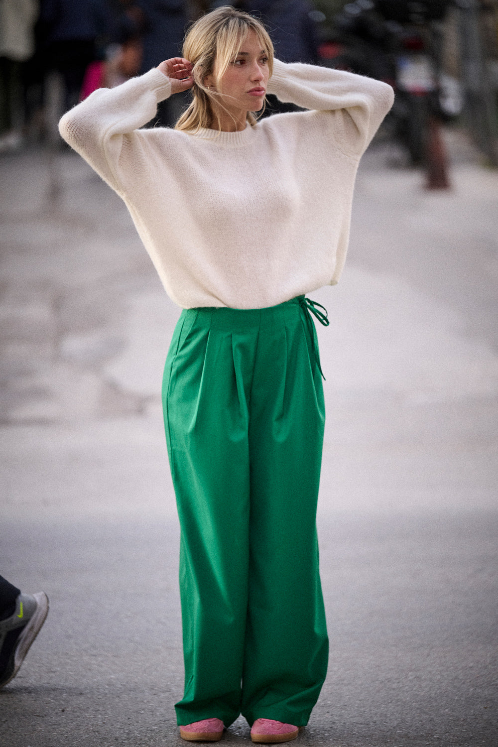 Un pantalon large en vert franc, pensé pour donner de l’allure sans compromettre le confort. Sa coupe fluide et ses plis à l’avant structurent la silhouette tout en laissant une liberté totale de mouvement. La taille haute affine, et le tombé droit allonge la jambe.