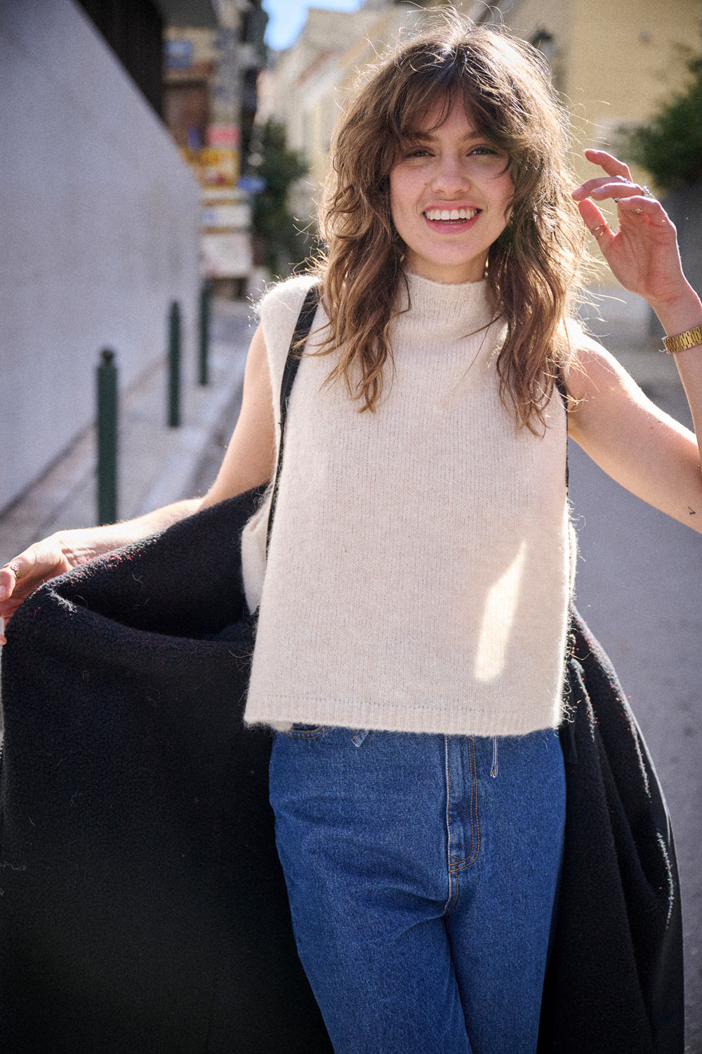 Laure a imaginé des bretelles élastiques à l’intérieur pour pouvoir l’enlever sans la poser, un détail ingénieux qui rend la parka encore plus vivante à porter.