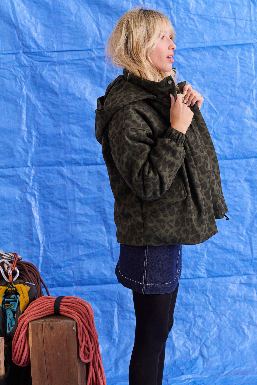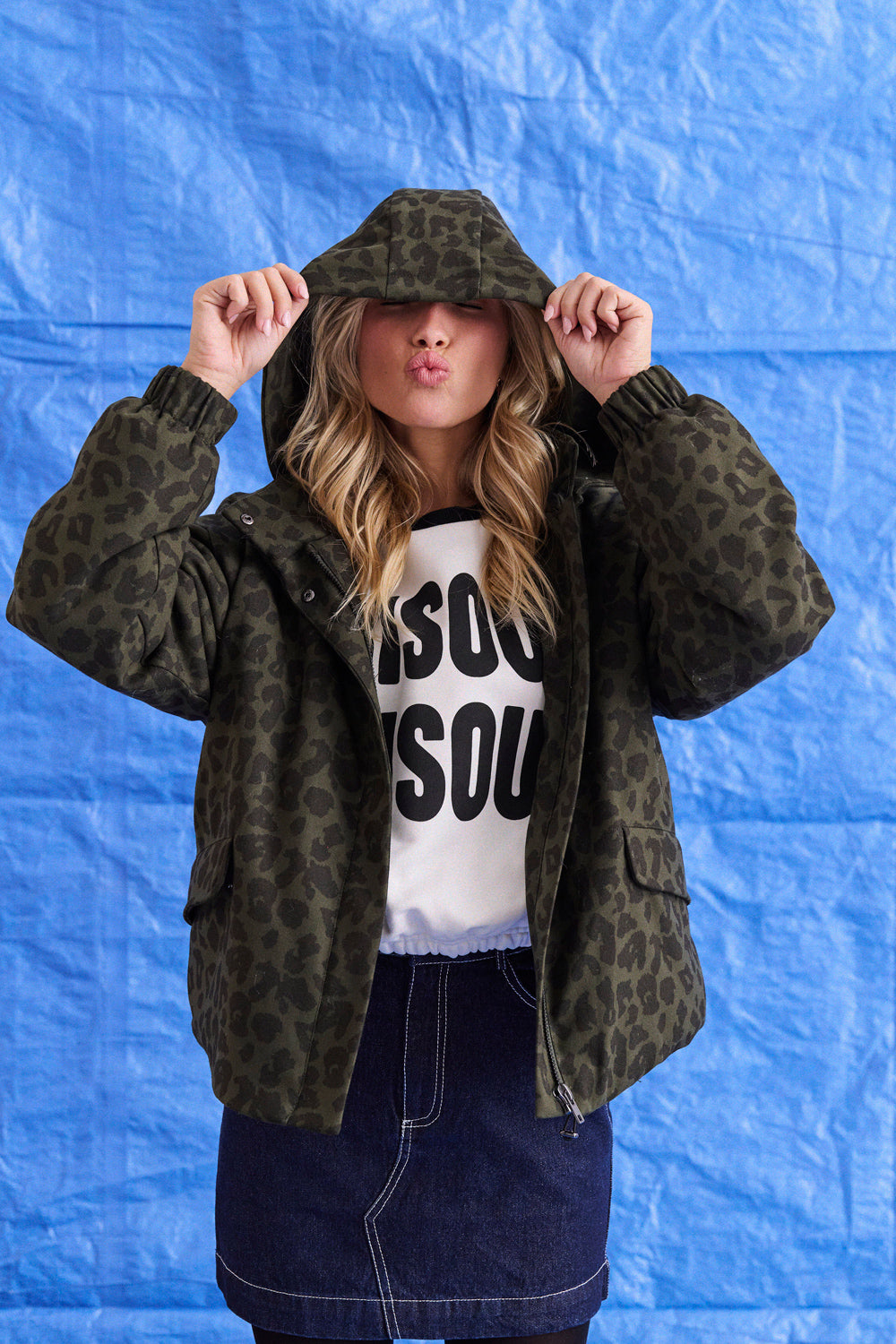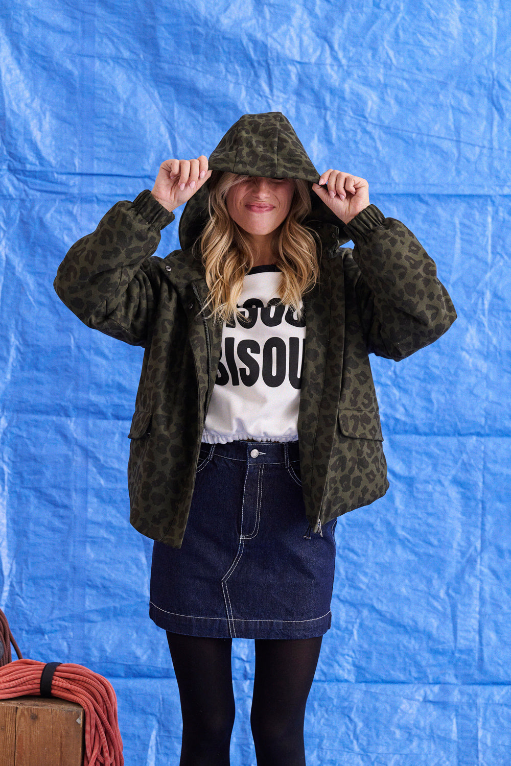 Coupe ample, capuche pratique et poches XXL : elle a tout du bon basique… sauf qu’elle est twistée par son imprimé léopard kaki et son intérieur tout doux. De quoi affronter les journées fraîches en restant stylée.