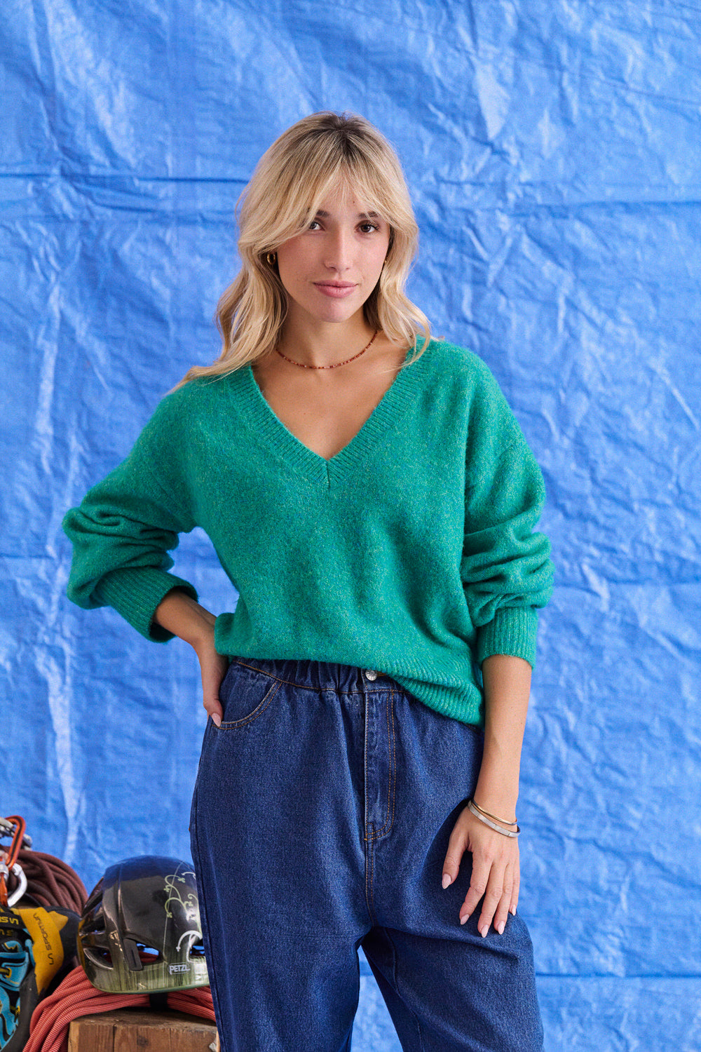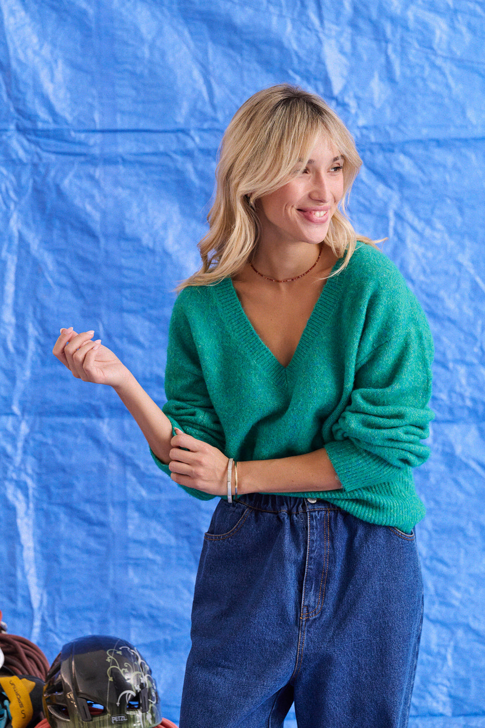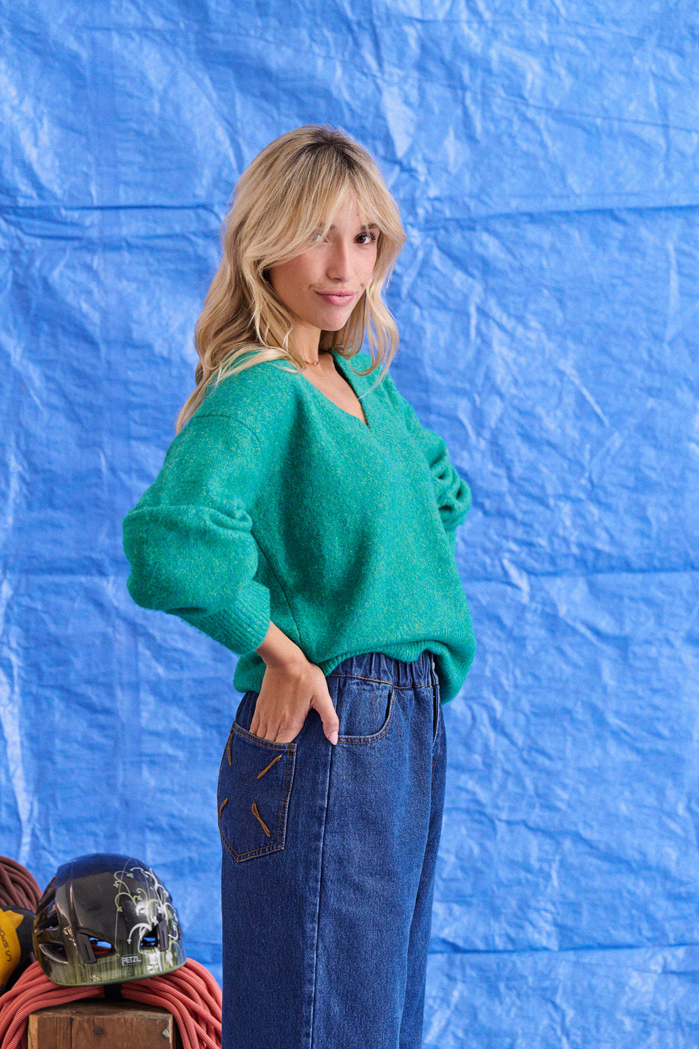 Laure a opté pour une maille plus resserrée au col, aux poignets et sur le bas, un contraste discret qui encadre le volume du pull et met la silhouette en valeur.