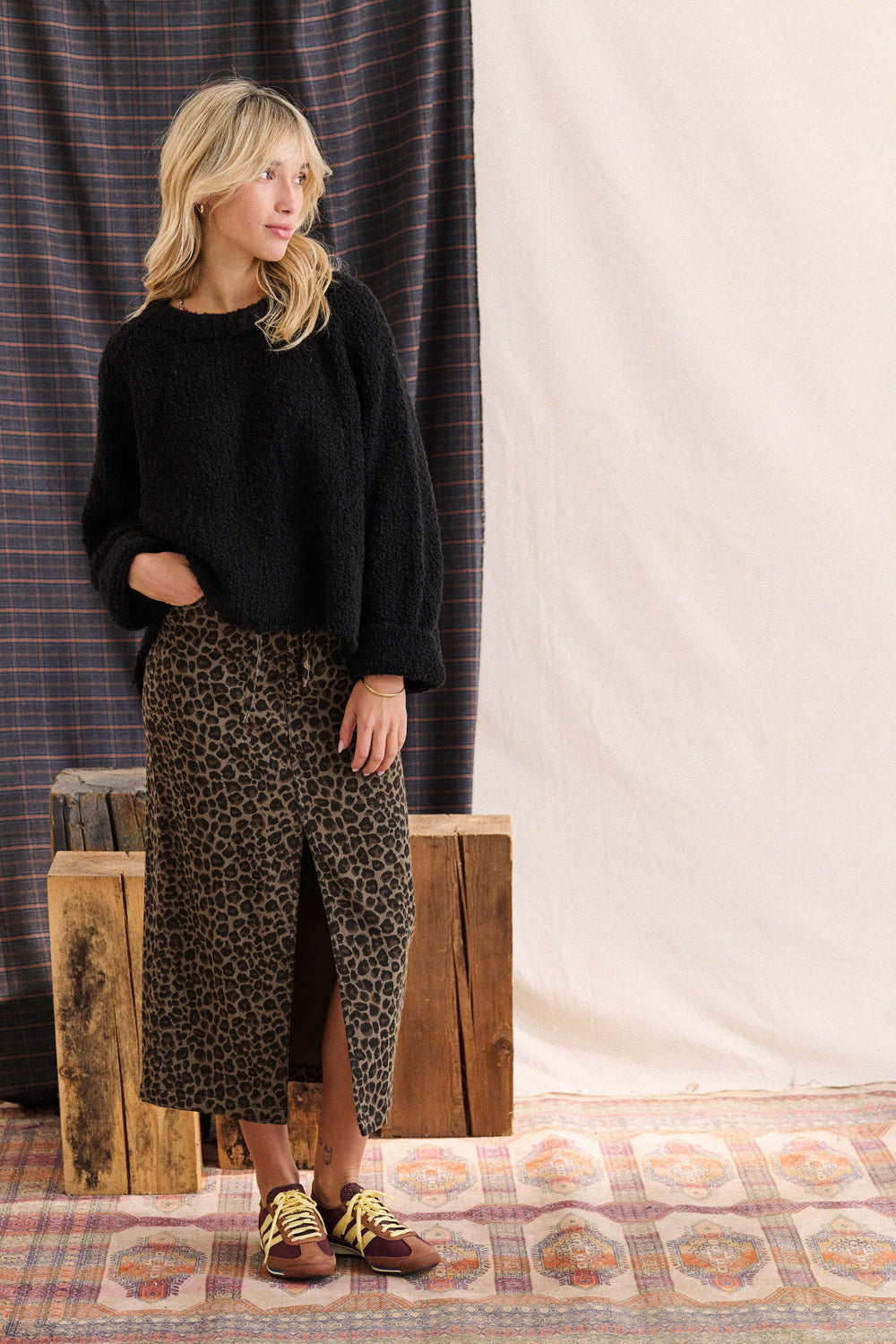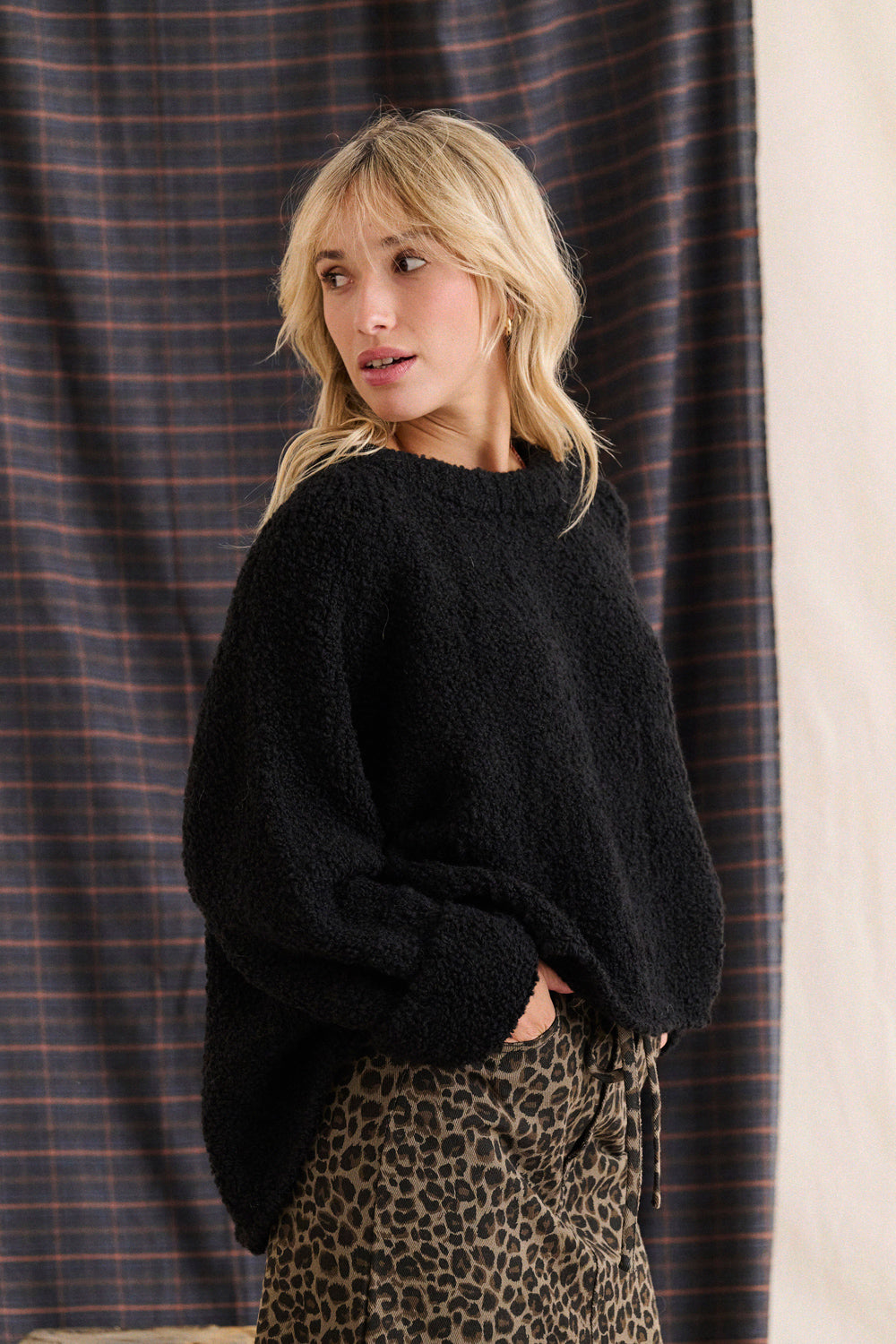 Coupe loose, épaules tombantes et manches larges : il enveloppe sans jamais alourdir. Sa texture bouclée apporte du relief et un côté réconfortant, parfait pour les journées fraîches.
