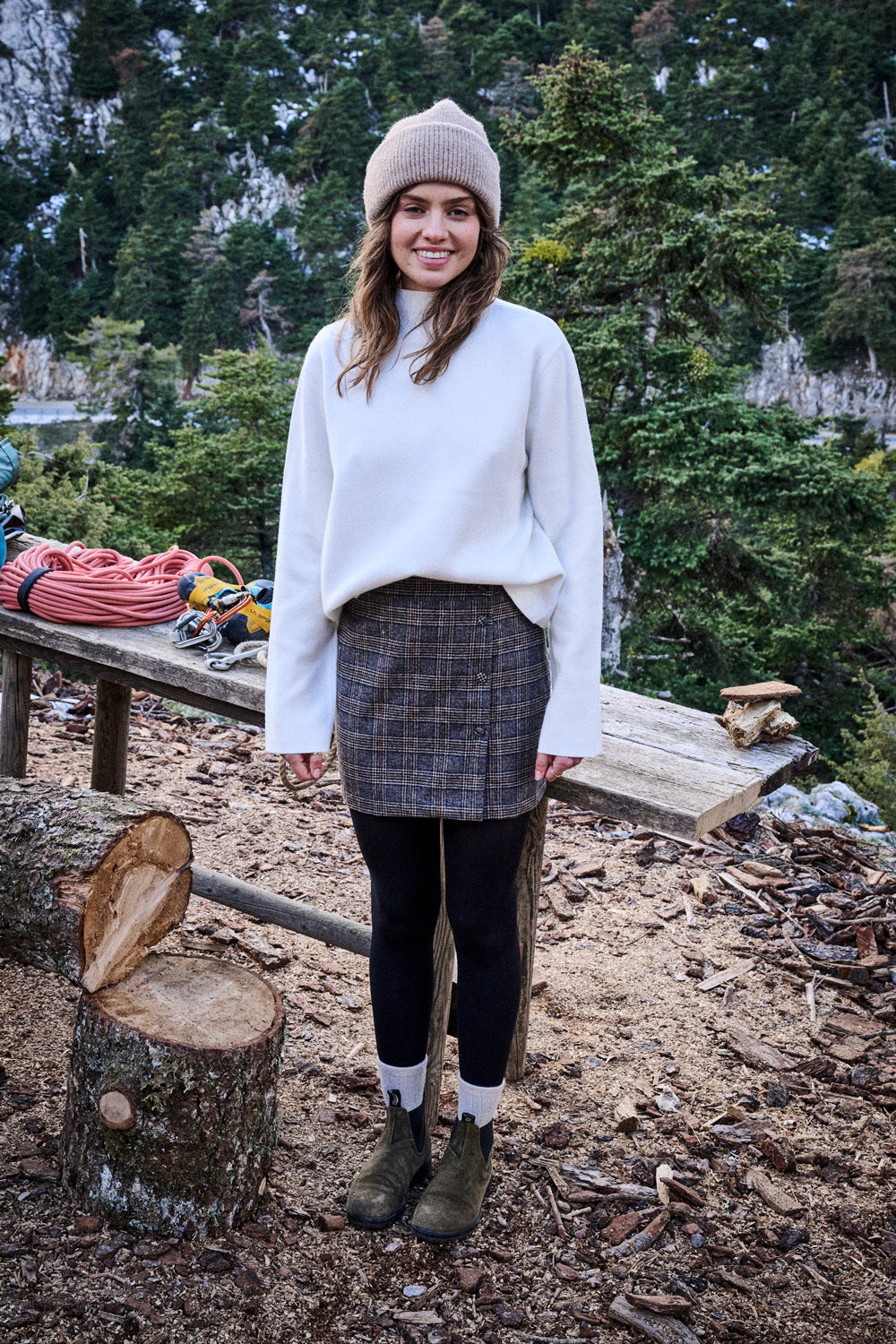 Sa texture compacte lui donne un tombé net, qui structure la silhouette. Avec son col montant et sa coupe droite, il se porte aussi bien sous une veste qu’en pièce à part entière sur un jean ou une jupe.