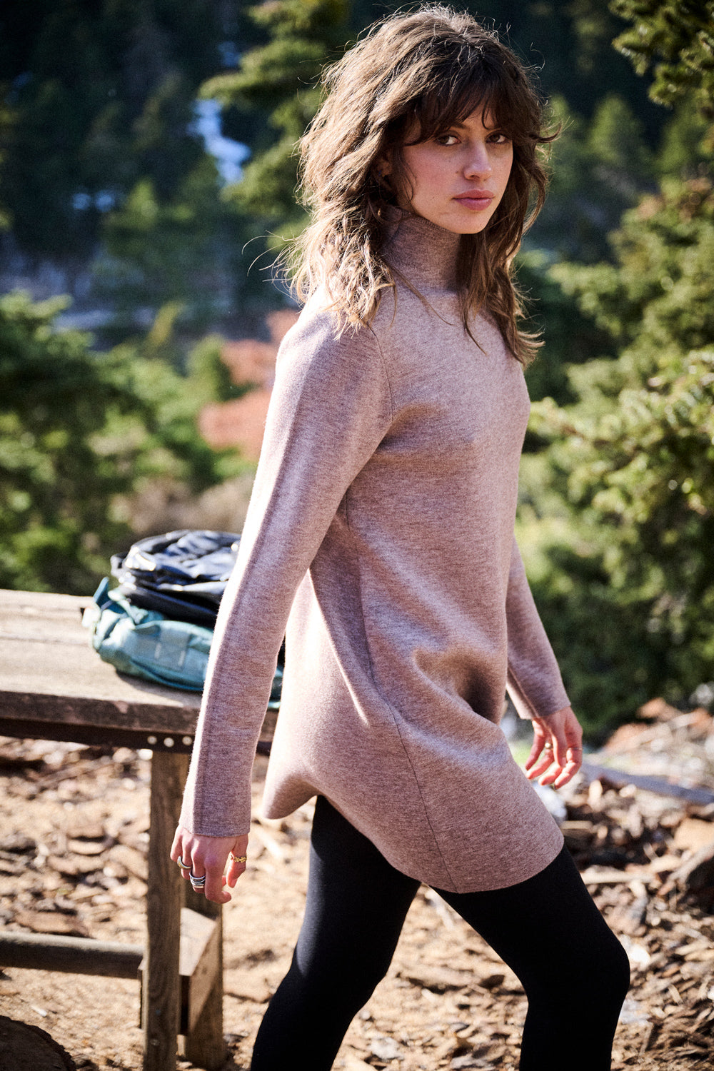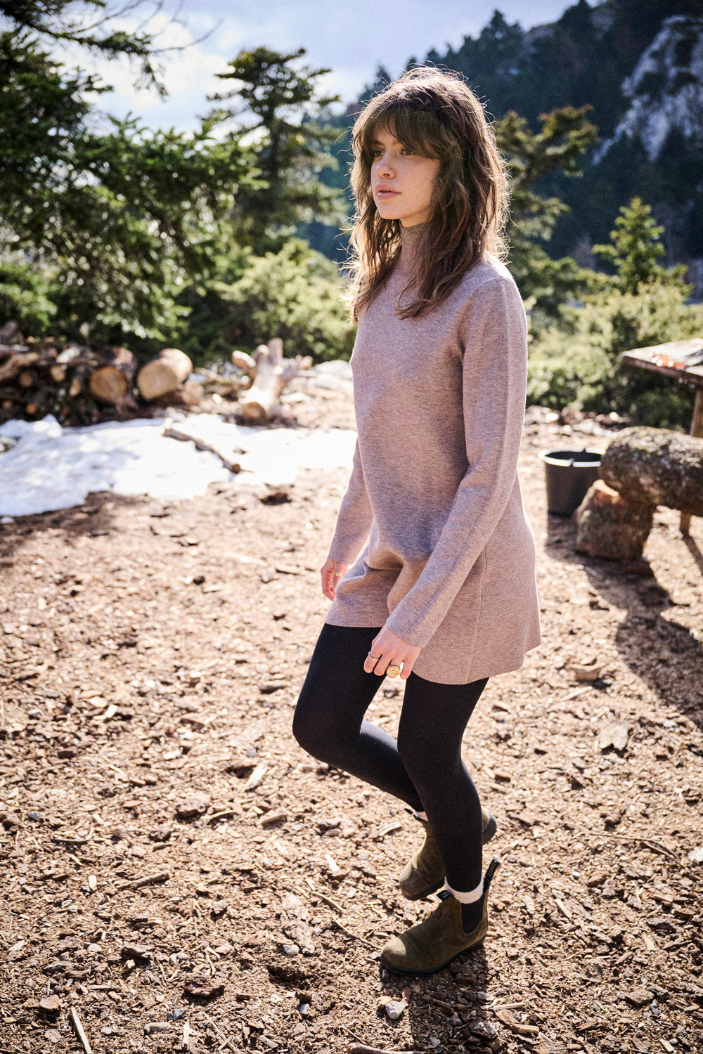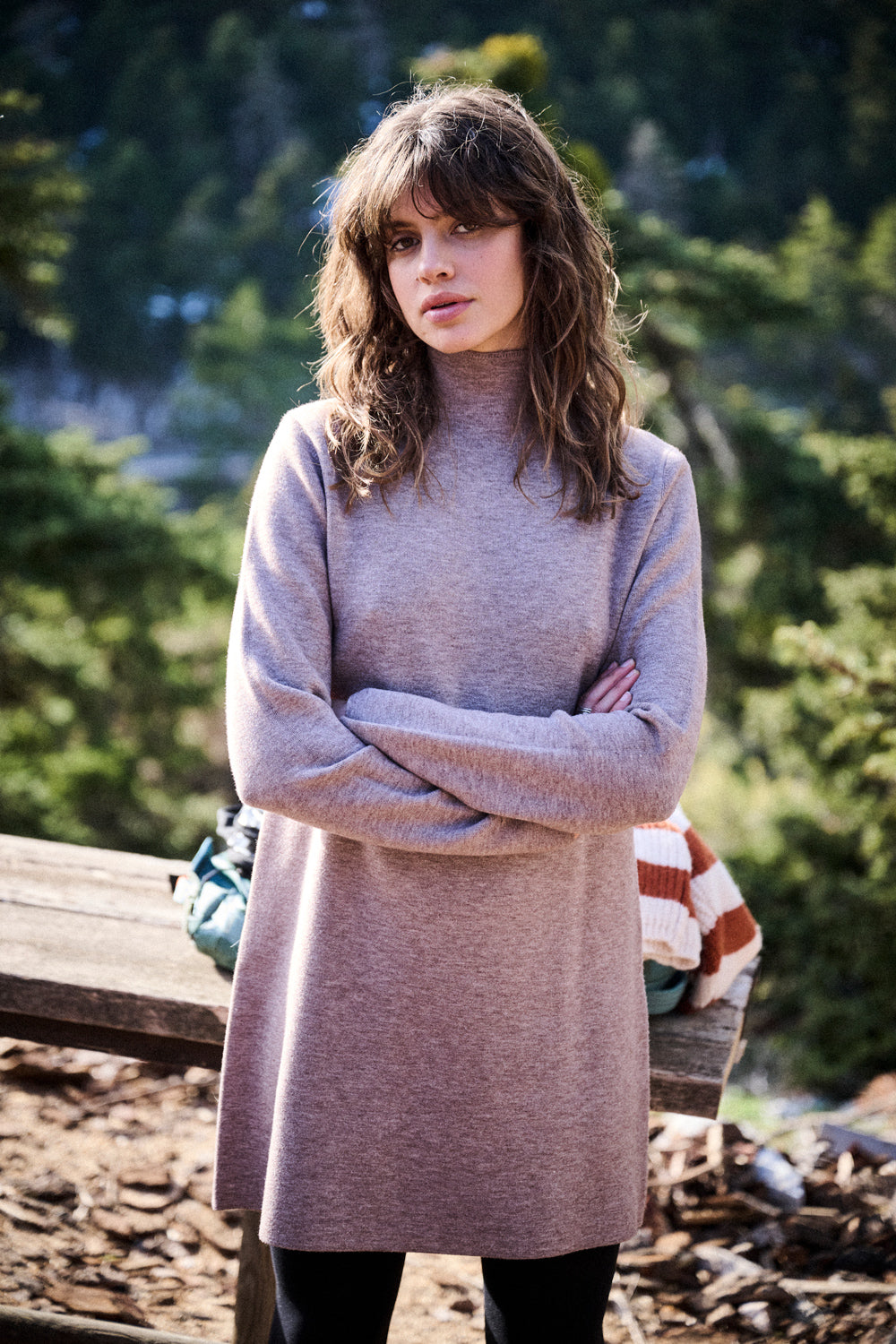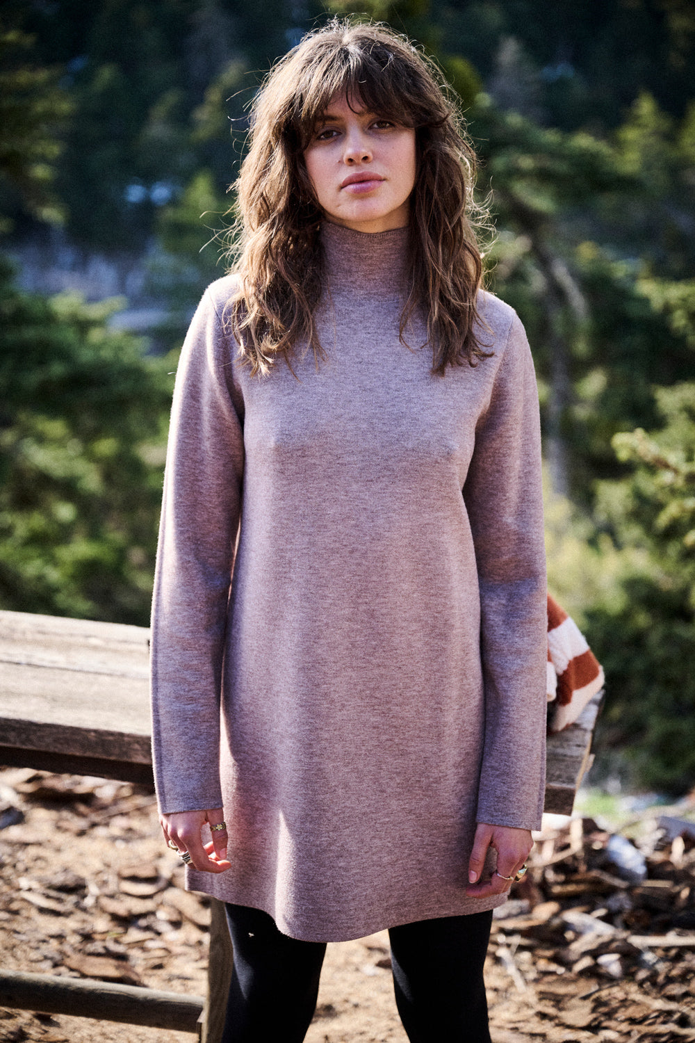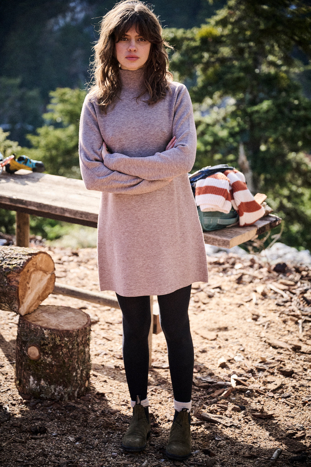 Sa texture compacte lui donne un tombé net et une allure structurée. Avec son col montant et sa coupe droite légèrement évasée, elle se porte seule avec des collants opaques et une paire de boots ou de talons.