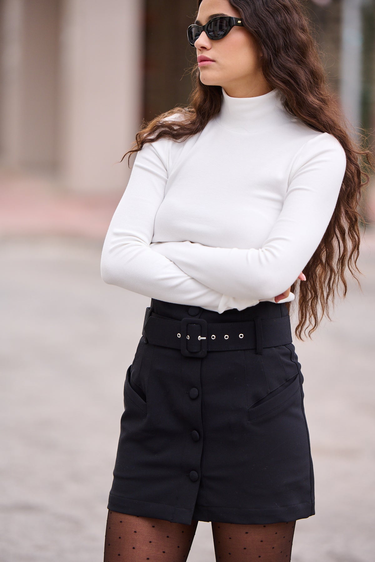 " C'est un basique de la garde-robe : un t-shirt côtelé à manches longues qui monte jusqu’au cou cette fois : parfait pour aller jogger au parc en hiver, ou encore à glisser sous un gilet sans manches pour le mettre en valeur. "