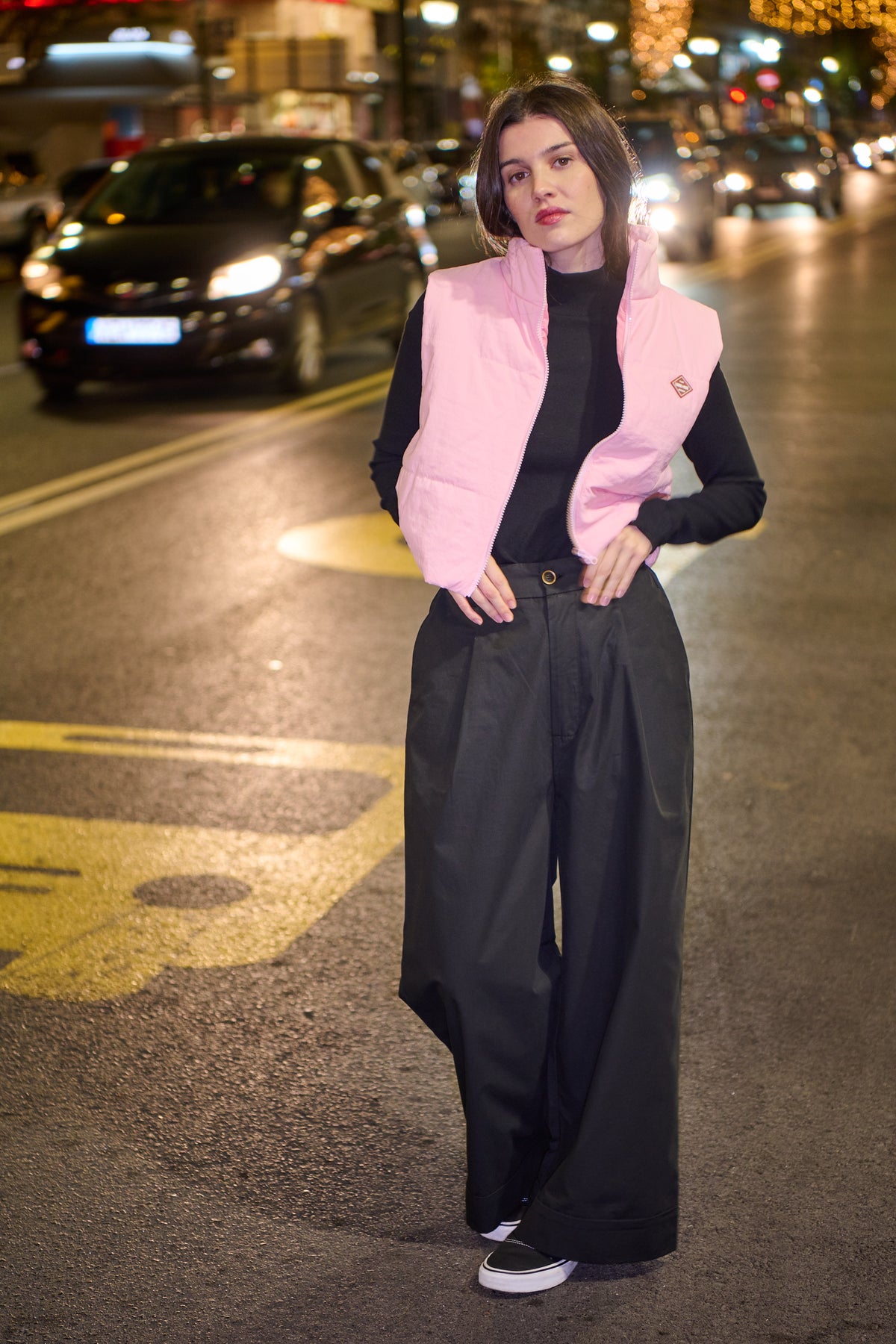 Elle porte le pantalon Pol noir, la robe Robin à carreaux verts et noirs et la doudoune sans manche Greg rose.