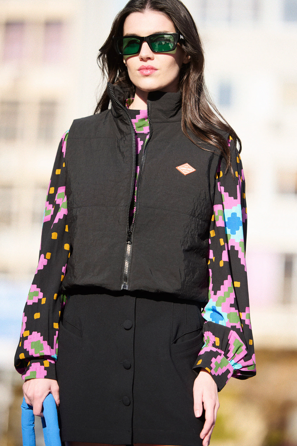 Elle porte la blouse Bala avec la mini jupe Jonas noire et la doudoune sans-manches Greg noire.