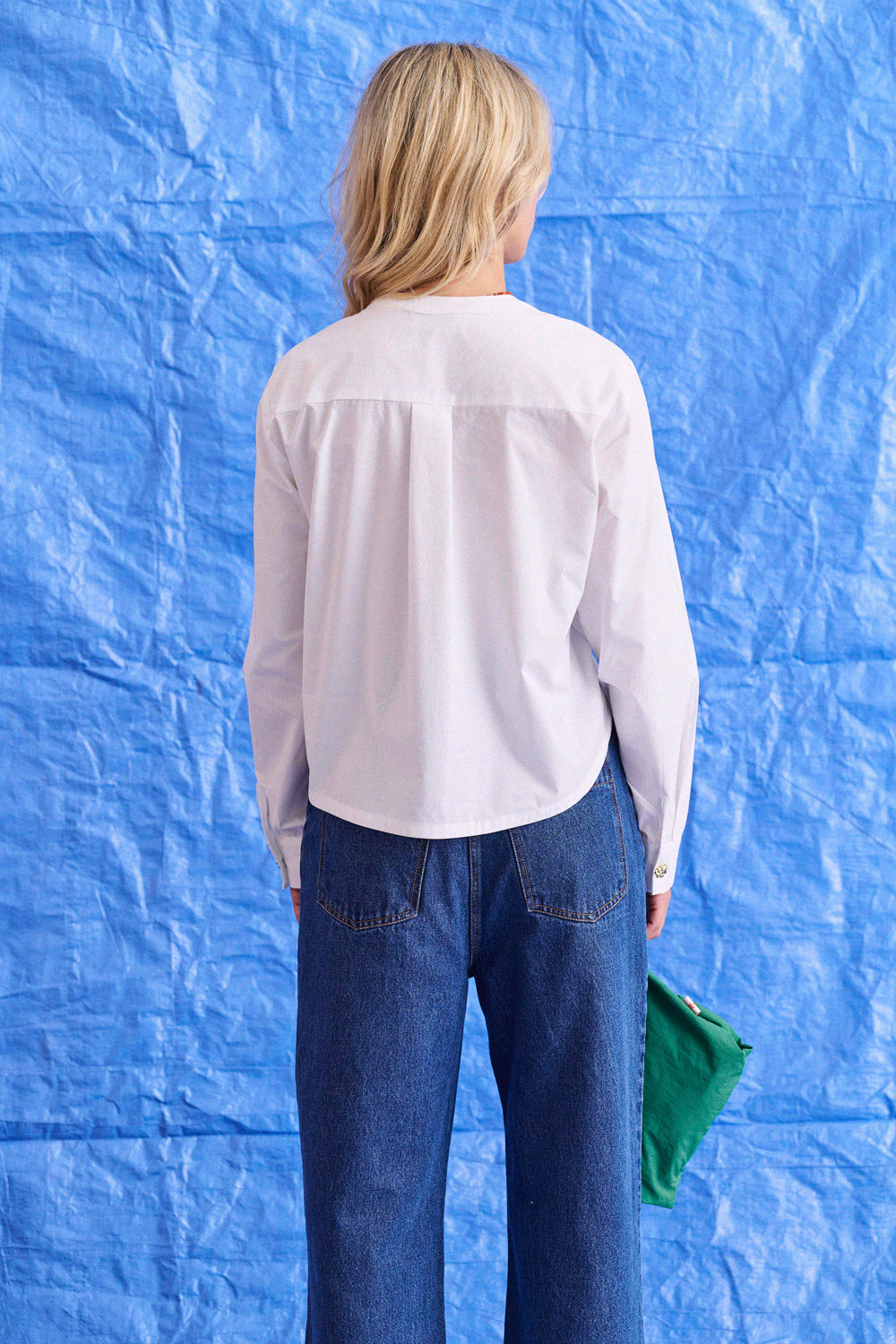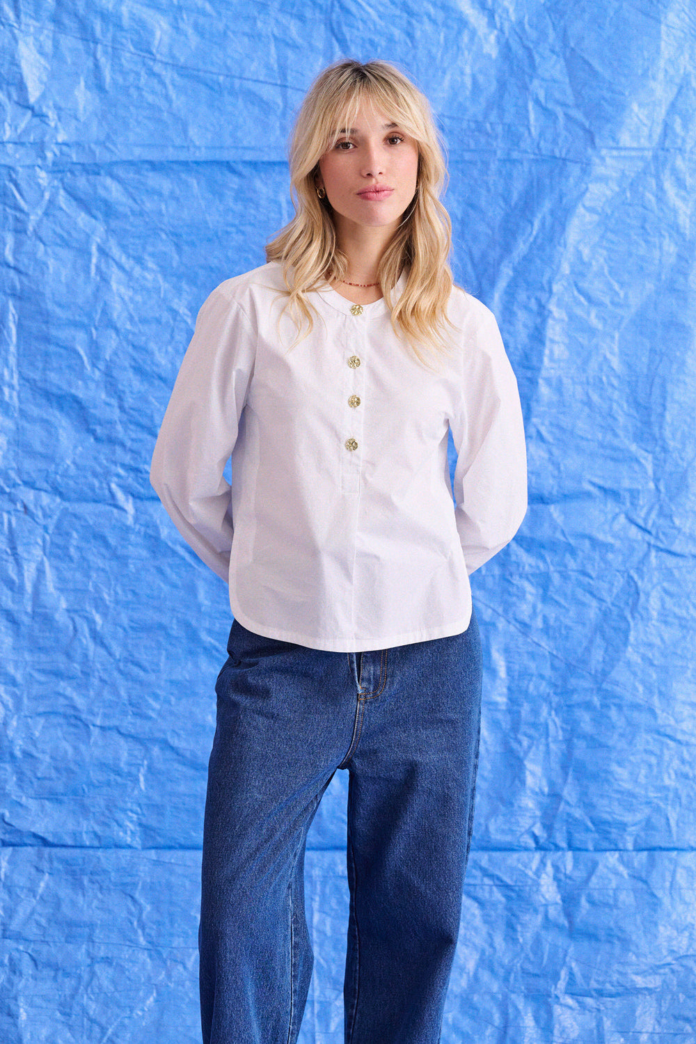 Coupe droite et encolure ronde, elle casse les codes du chemisier classique. À la fois simple et affirmé, il se glisse dans un jean ou sous une veste sans jamais passer inaperçu.
