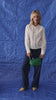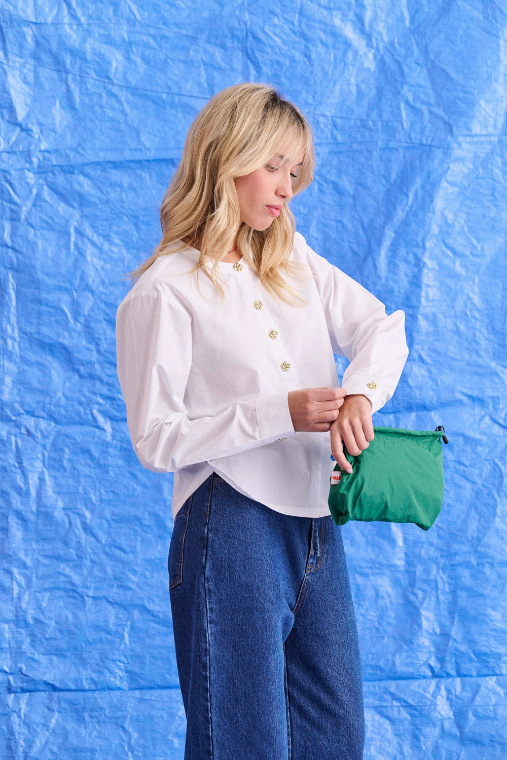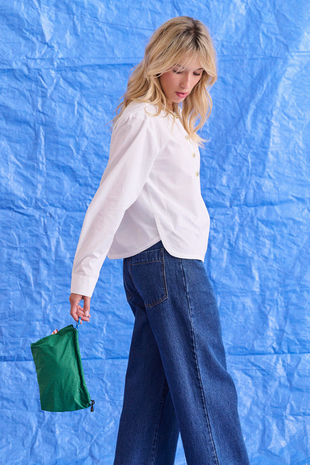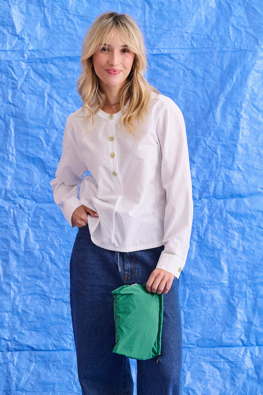 Sur les photos, Berta porte également le jean évasé Percy, ainsi que le sac à main Astrid vert.