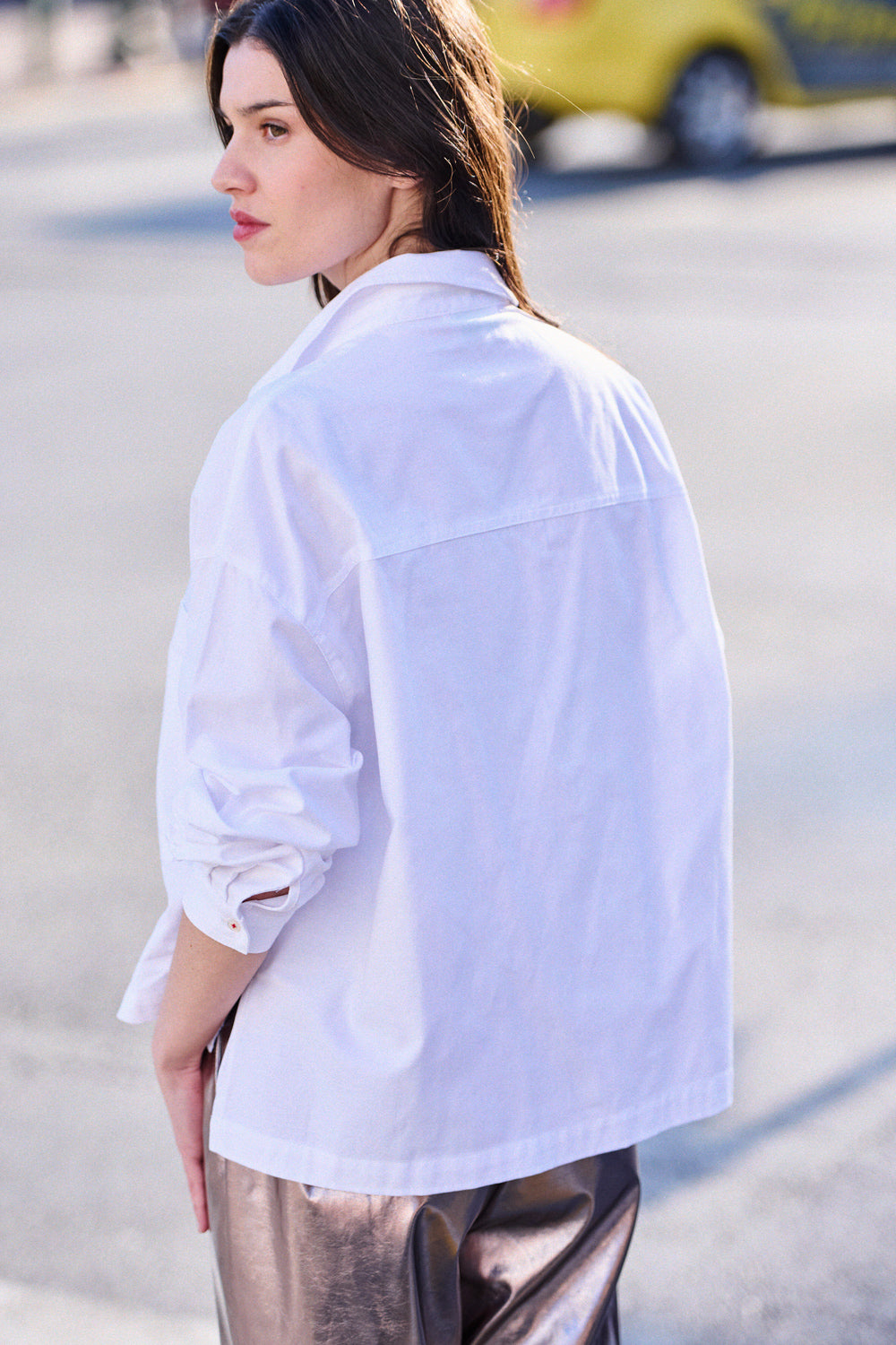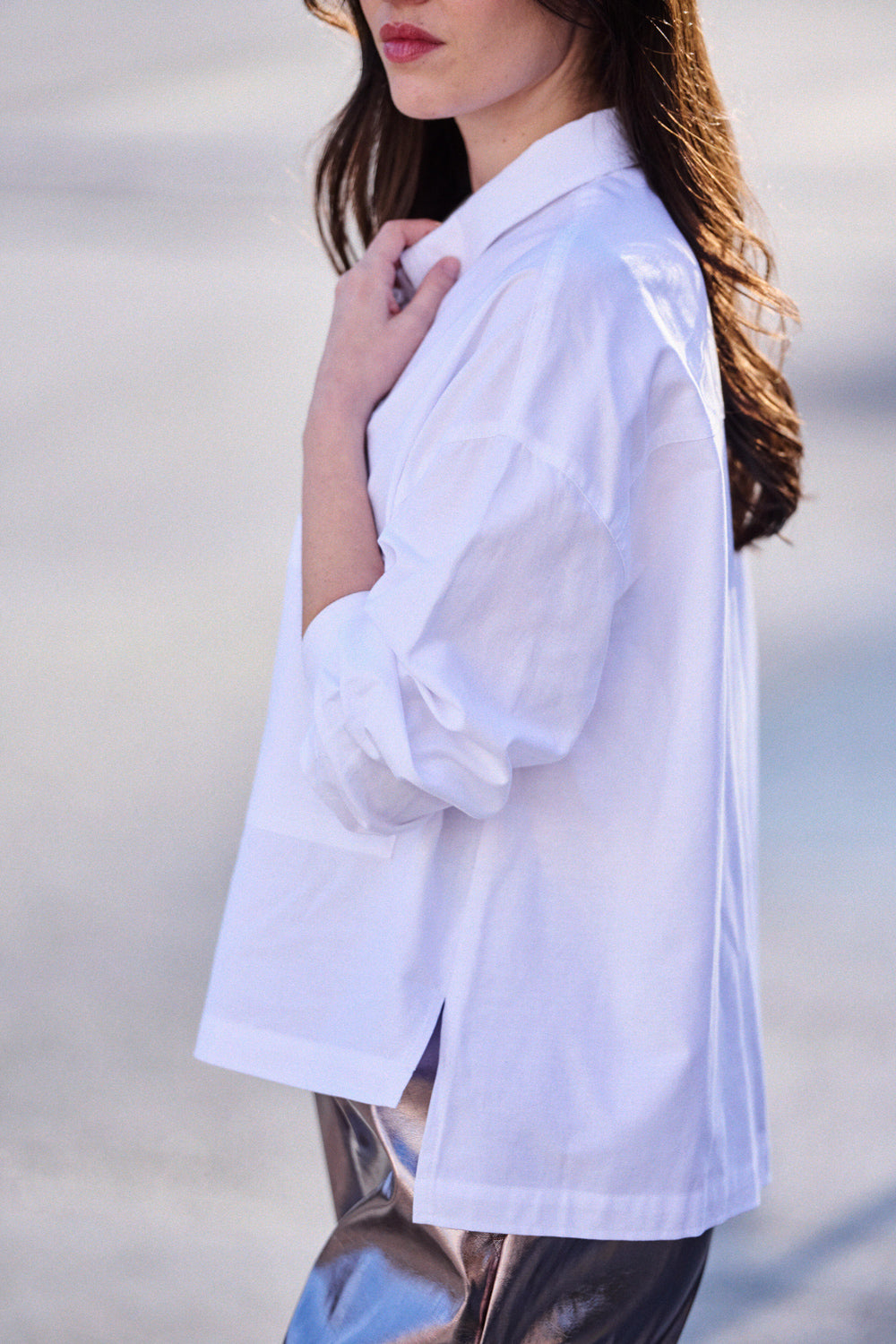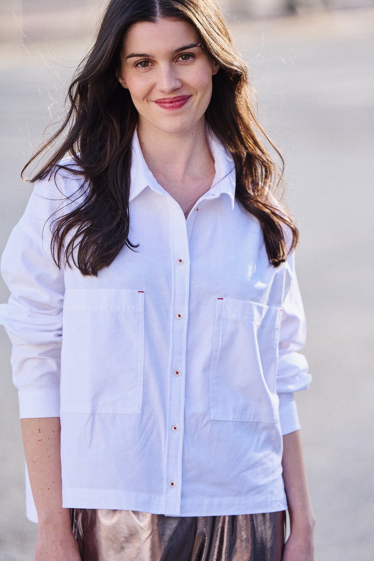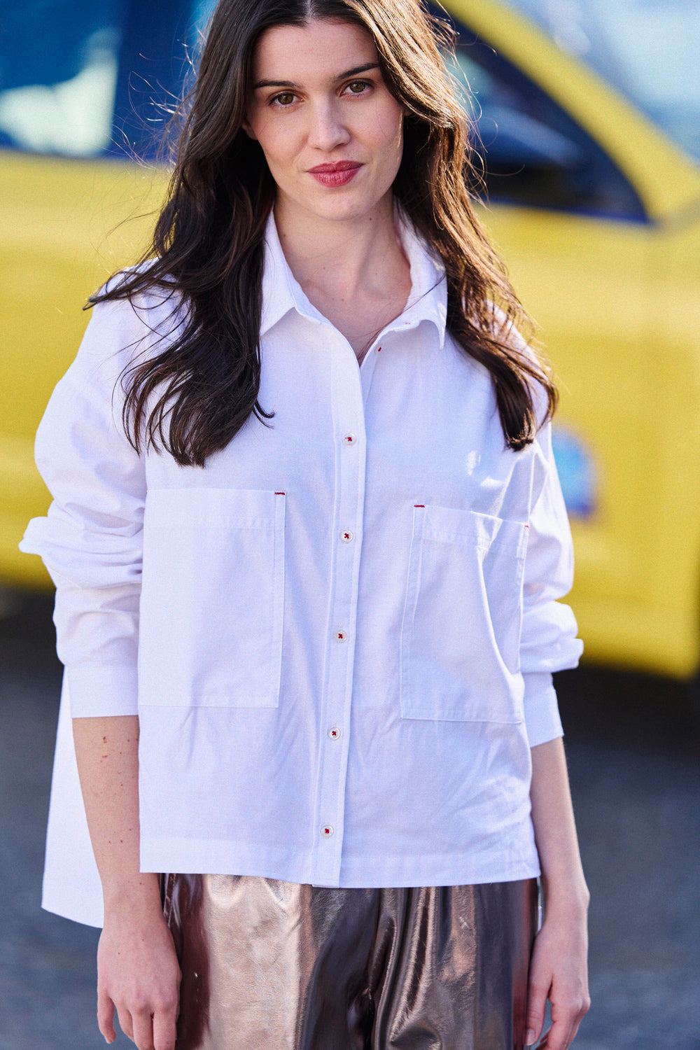 " La chemise Chanez a une forme carrée et est un peu plus courte qu'une chemise classique, ce qui la rend super cool. On adore le détail du fil de couleur des boutons, qui est cousu en croix "
