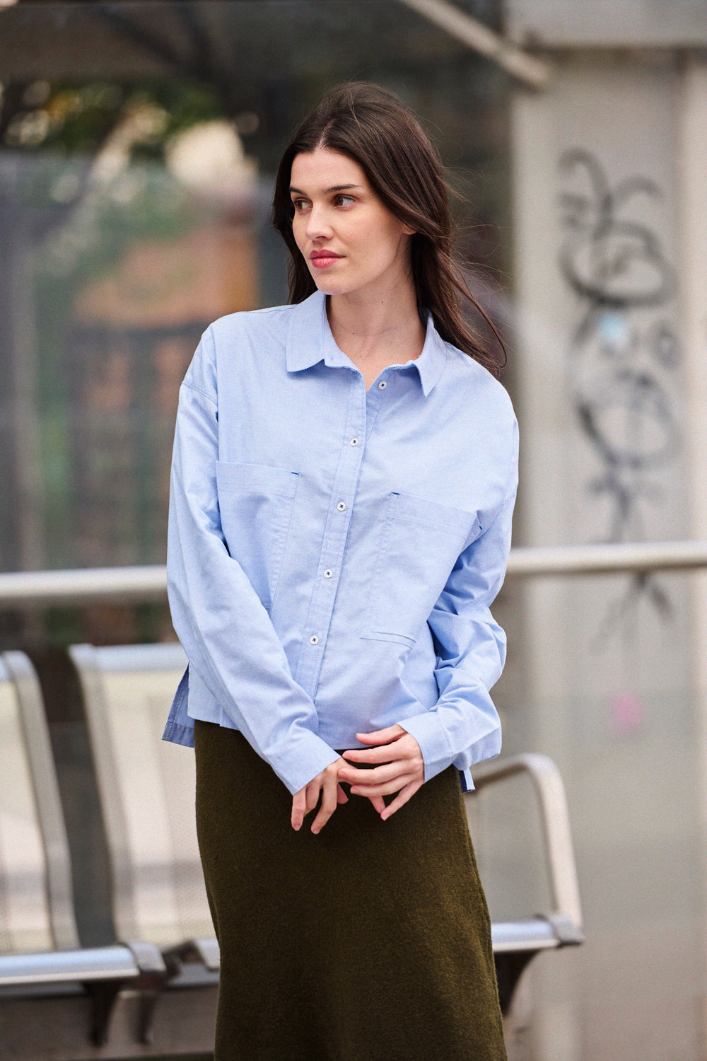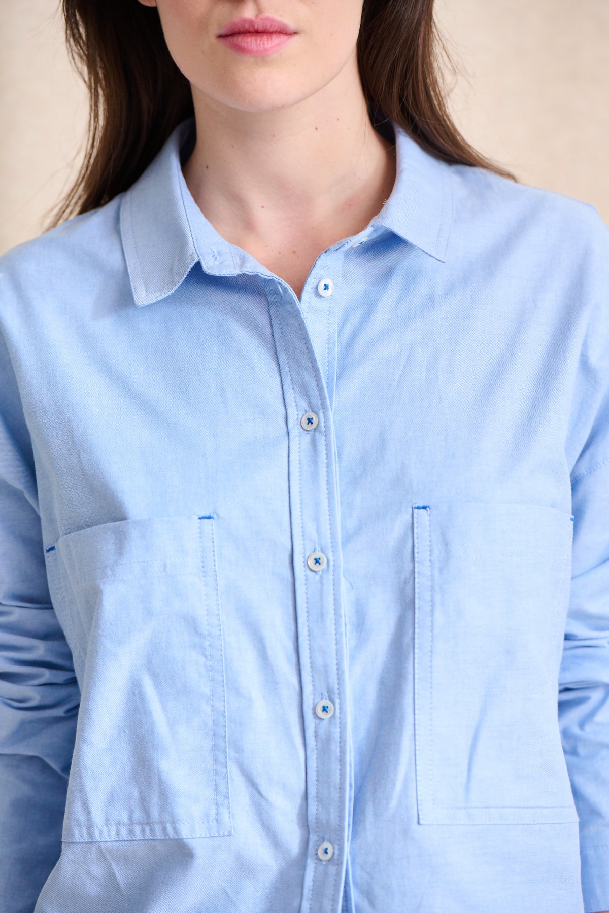 " La chemise Chanez a une forme carrée et est un peu plus courte qu'une chemise classique, ce qui la rend super cool. On adore le détail du fil de couleur des boutons, qui est cousu en croix "