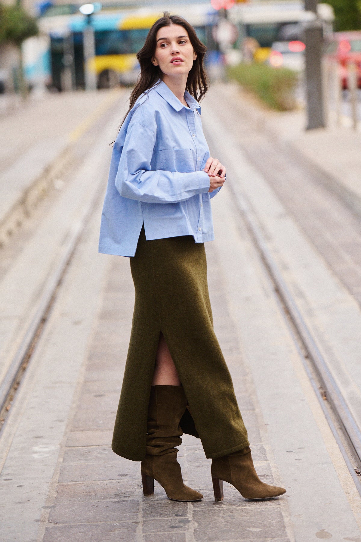 Elle porte le jean Paolo et la jupe en maille Juno kaki.