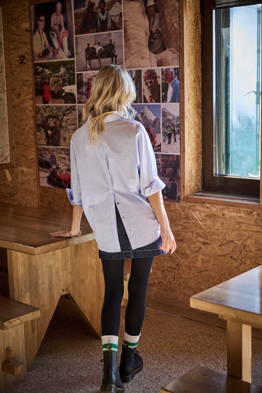 Cette chemise oversize en coton revisite l’intemporelle chemise bleue. Son ouverture au dos lui donne ce petit plus qui fait la différence. Casual, mais toujours stylée !