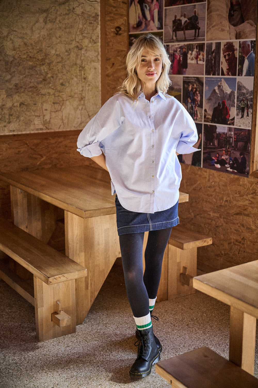 Sur les photos, Berta porte également la mini-jupe en jean Jim aux surpiqures contrastées.