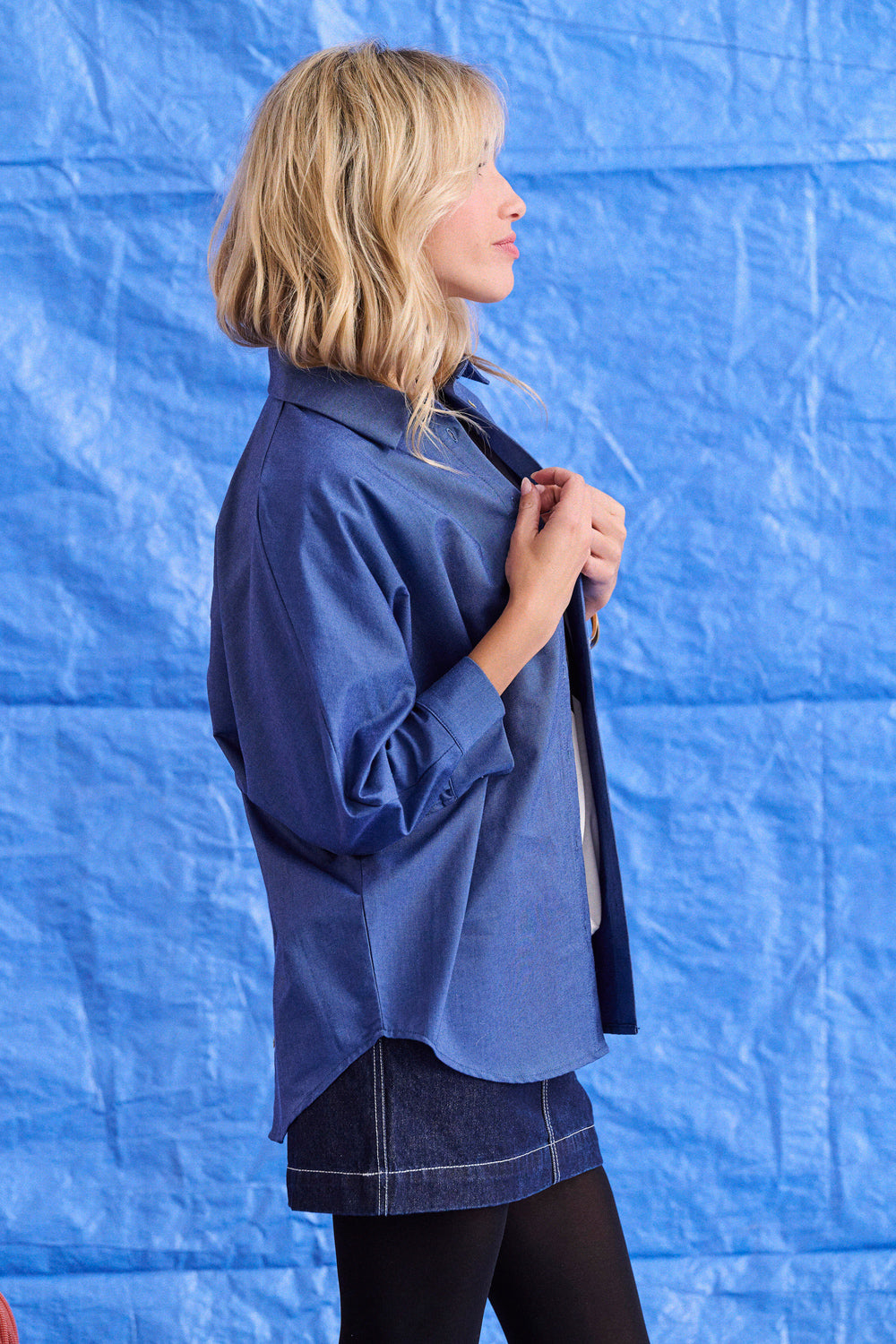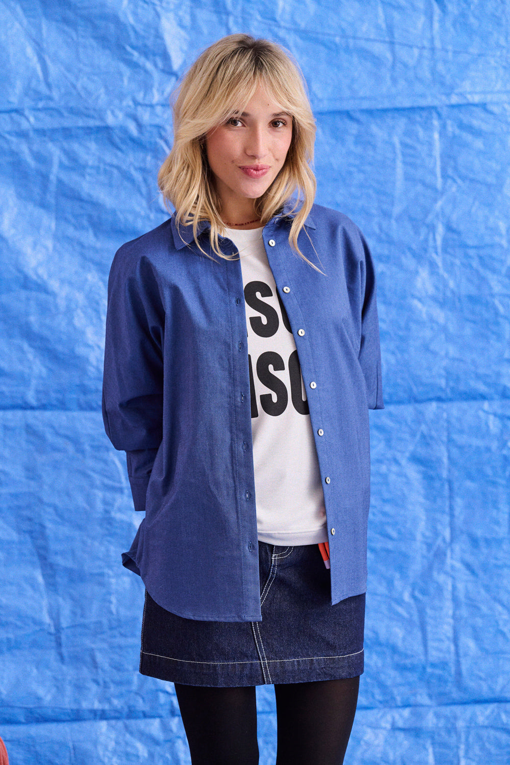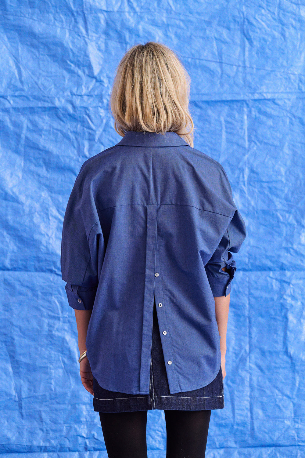 Cette chemise oversize en coton revisite l’intemporelle chemise bleue. Son ouverture au dos lui donne ce petit plus qui fait la différence. Casual, mais toujours stylée !