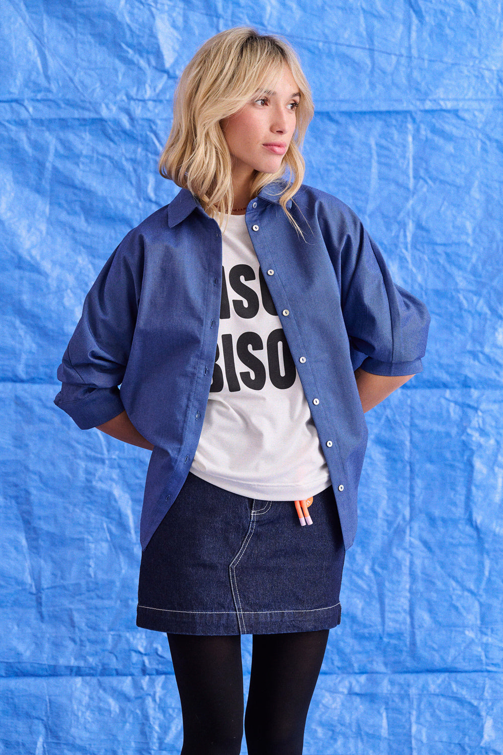 Sur les photos, Berta porte également le t-shirt à message Trey Bisou et la jupe en denim Jim aux surpiqures contrastées.