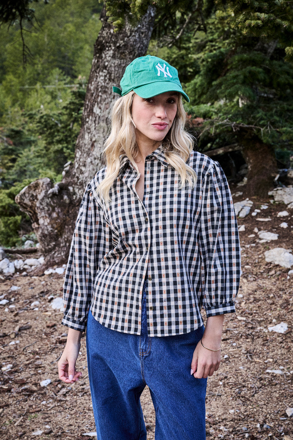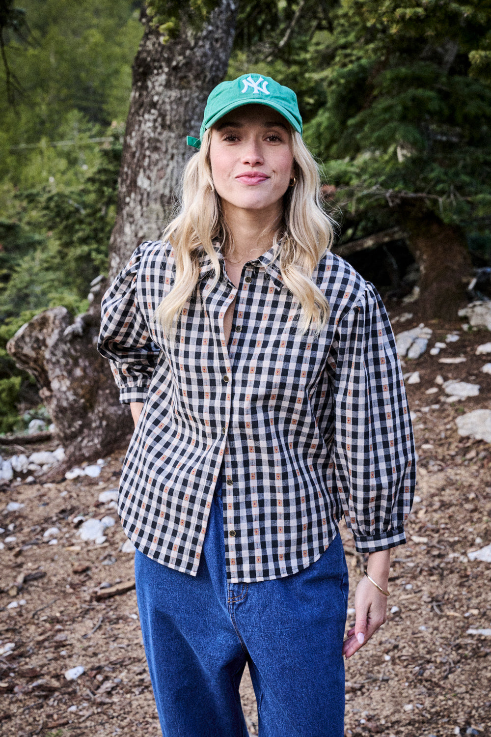 Sur les photos, Berta porte tantôt le jean Prima, tantôt le pantalon Pali vichy brodé assorti.