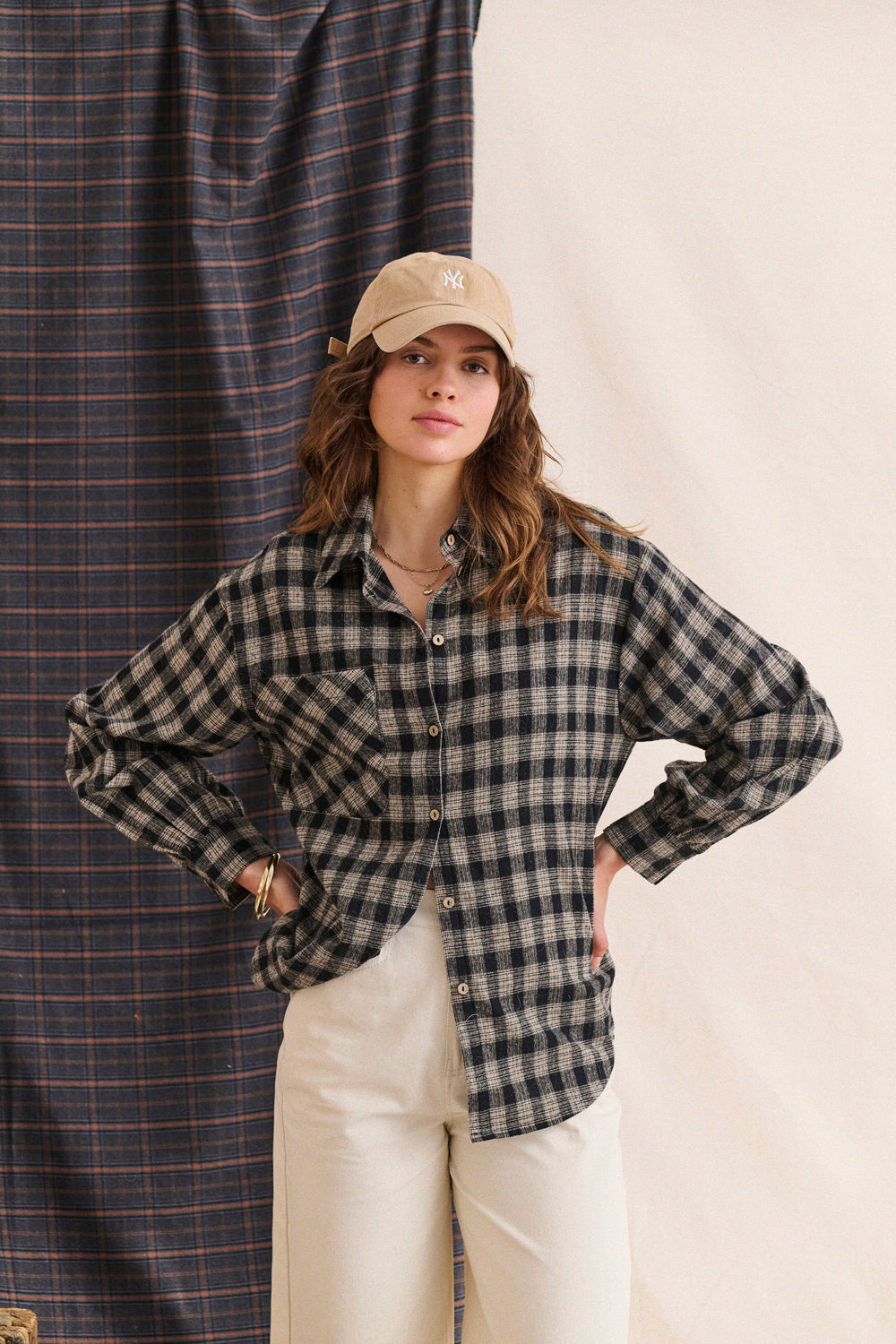 La chemise à carreaux revisitée : ample, douce et facile à porter, elle coche toutes les cases du quotidien. Sa coupe légèrement oversize lui donne ce côté cool, qu’on la porte ouverte sur un tee-shirt ou fermée.