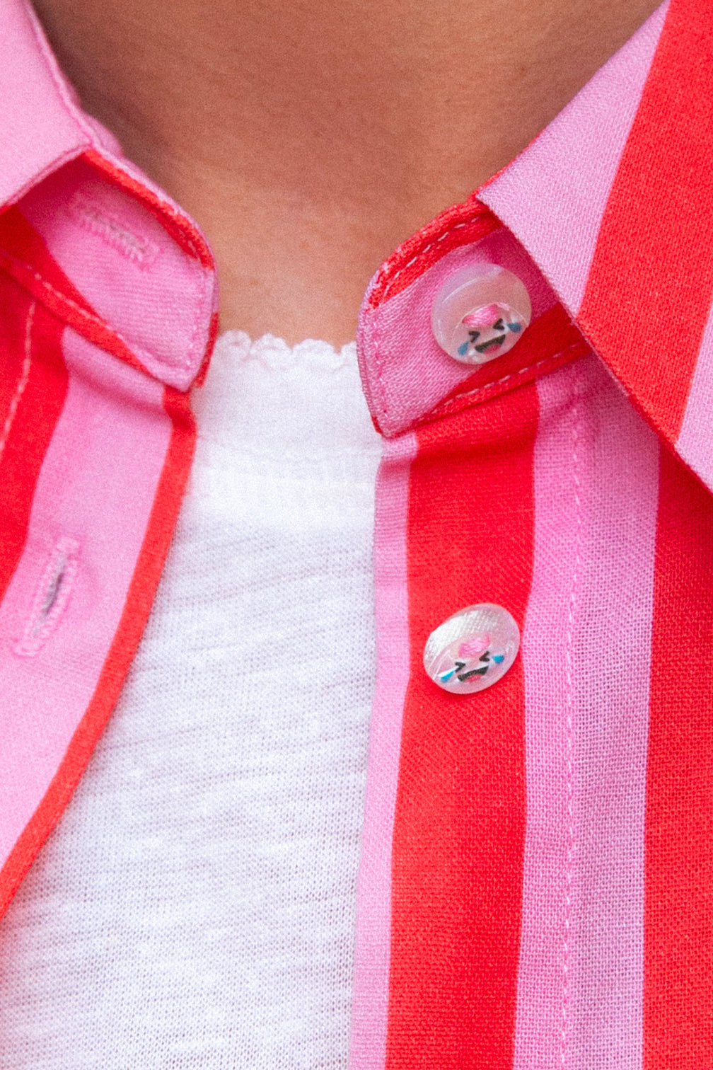 Laure et Lulu ont chiné des boutons fantaisie légèrement nacrés avec une petite tête qui pleure de rire. Un clin d’œil caché, une micro-joie au moment de s’habiller.