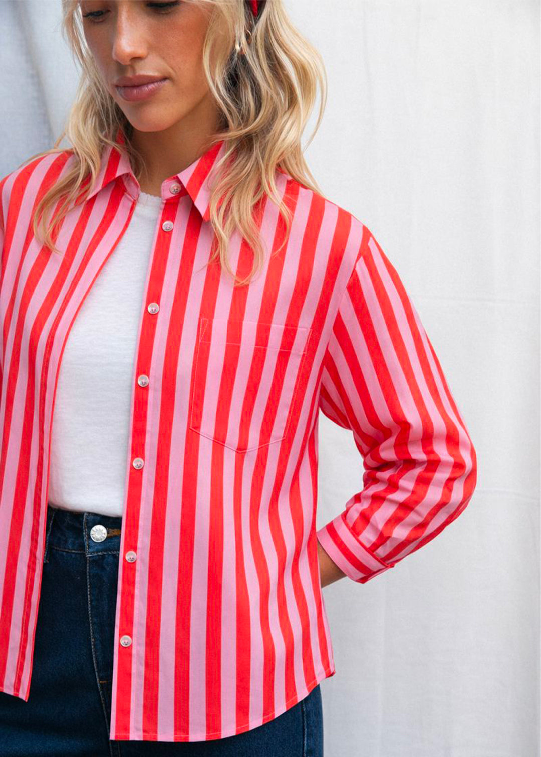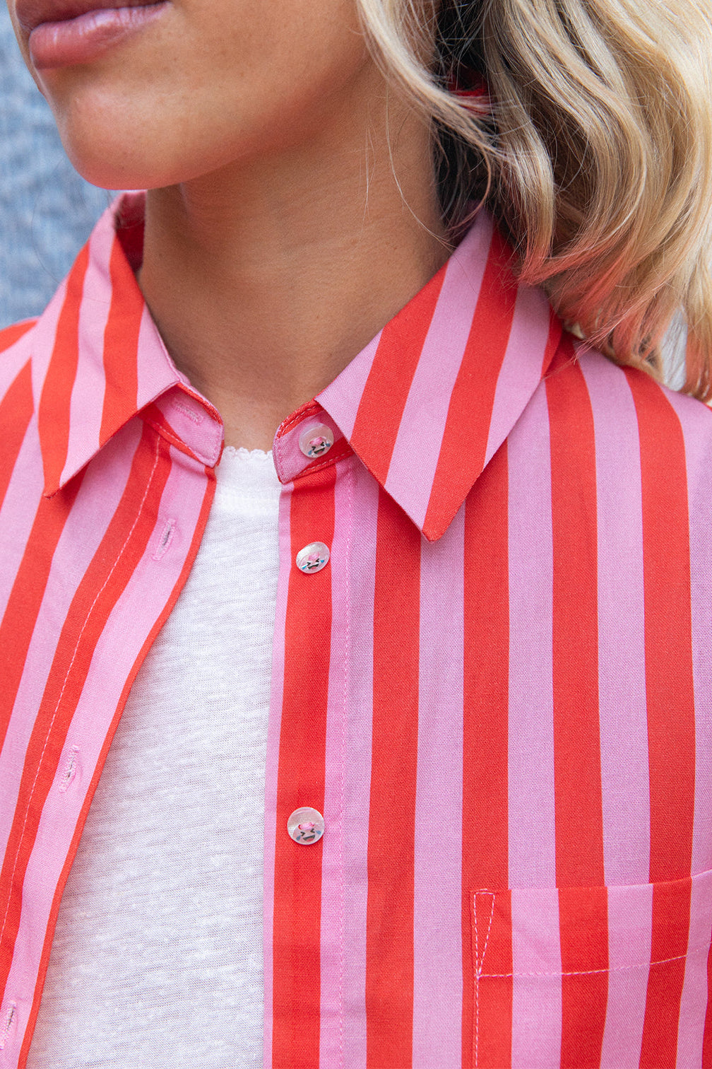 Le rose framboise se mélange avec un rose plus tendre, comme un coucher de soleil capturé sur tissu. C’est frais, lumineux, affirmé. La coupe est droite, volontairement simple, avec des détails soignés : col classique, boutons fantaisies, rayures tissées, poche discrète. Rien à ajouter, tout est parfait.