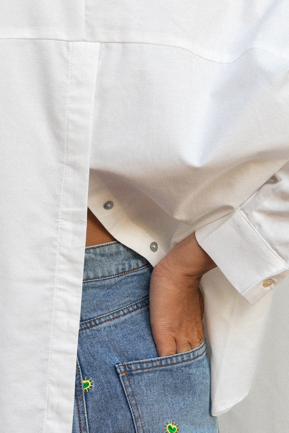 Le blanc, ici, n’est jamais plat. Le relief du piqué capte la lumière et donne du caractère à la pièce. Une chemise pensée pour structurer une silhouette, portée avec un jean, un pantalon imprimé ou en superposition.