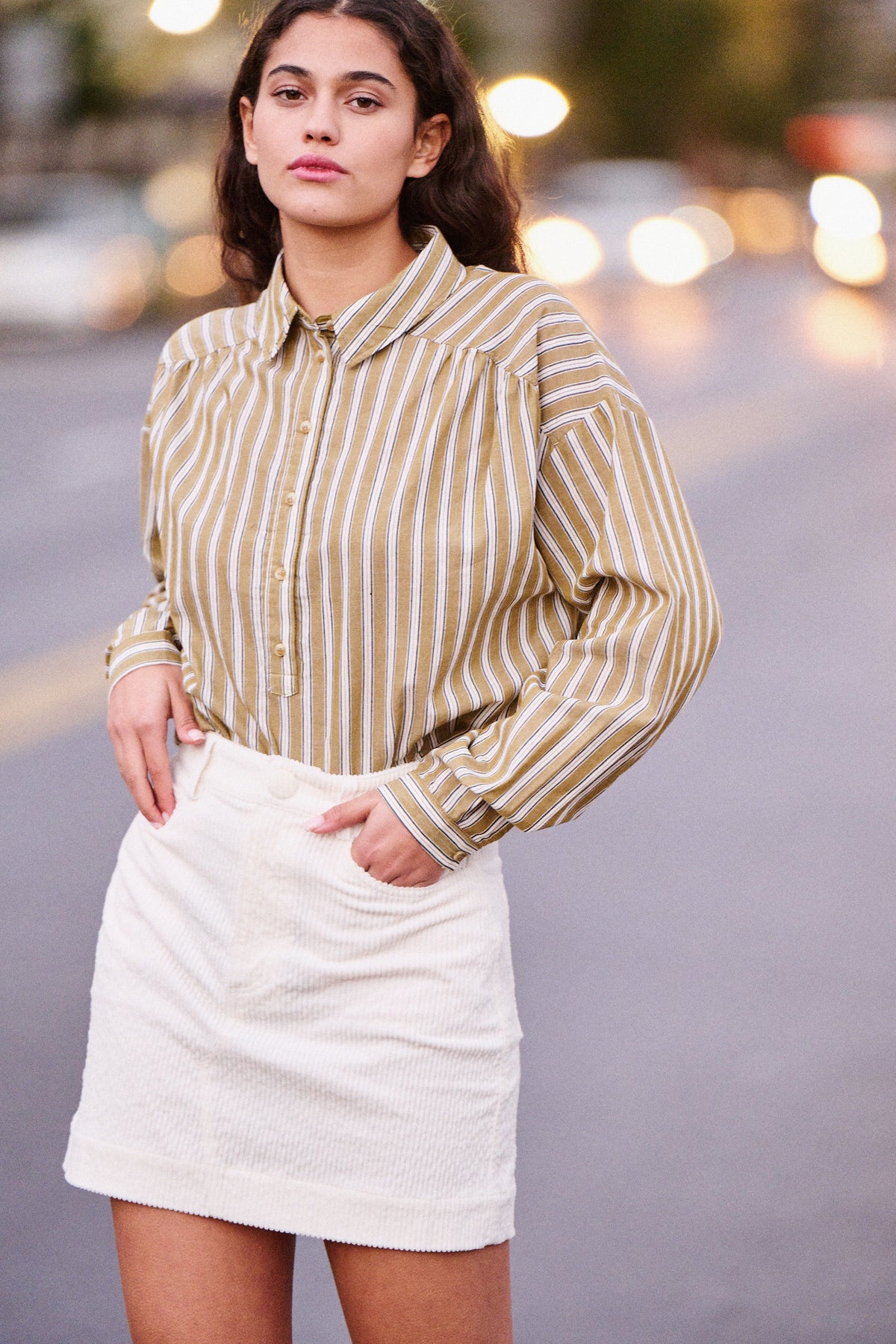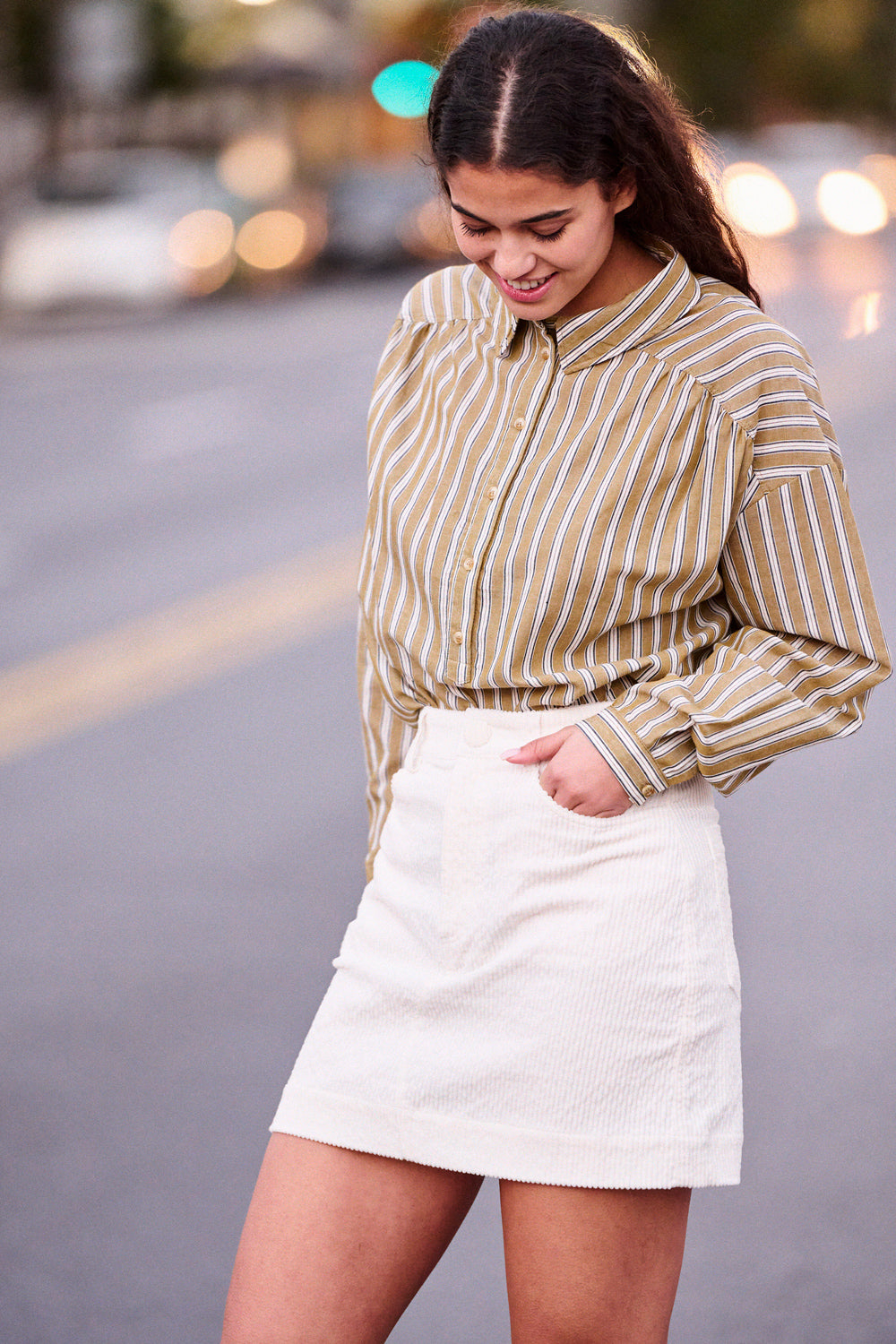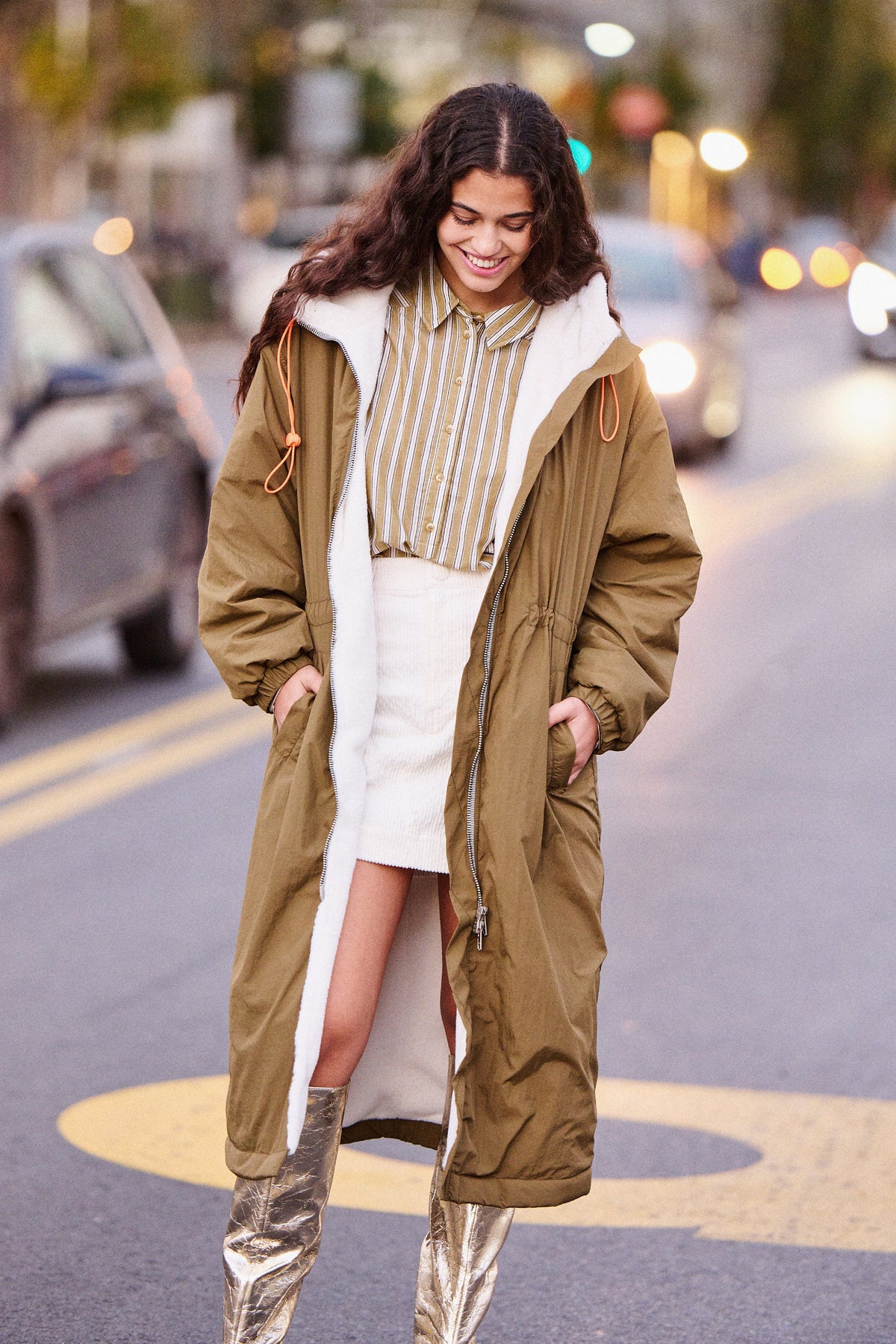 Elle porte la jupe en velours côtelé Jim écrue et la parka Gilen kaki.