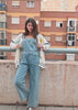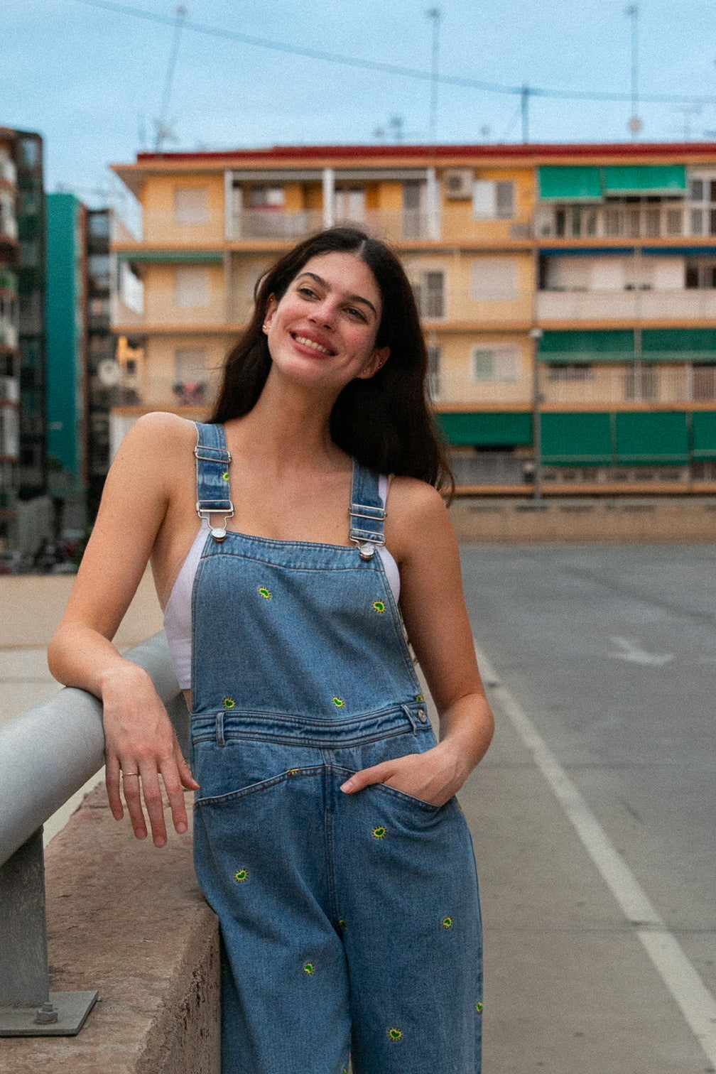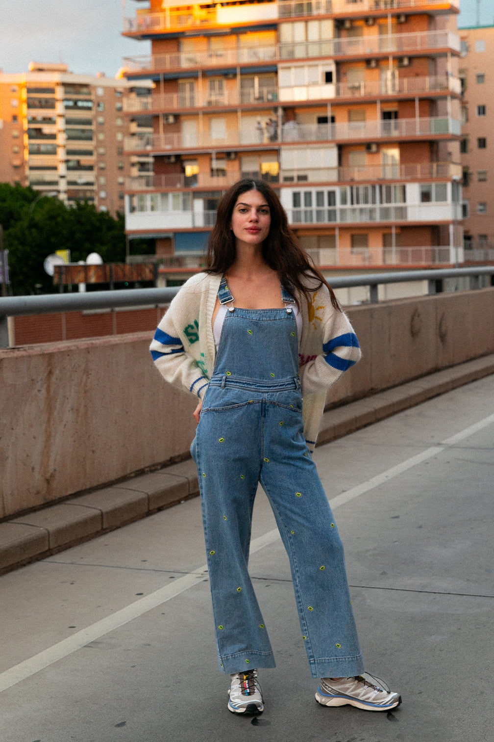 Une coupe droite, un denim souple, des bretelles réglables et surtout... des petits cœurs brodés partout, qui apportent juste ce qu’il faut de caractère.