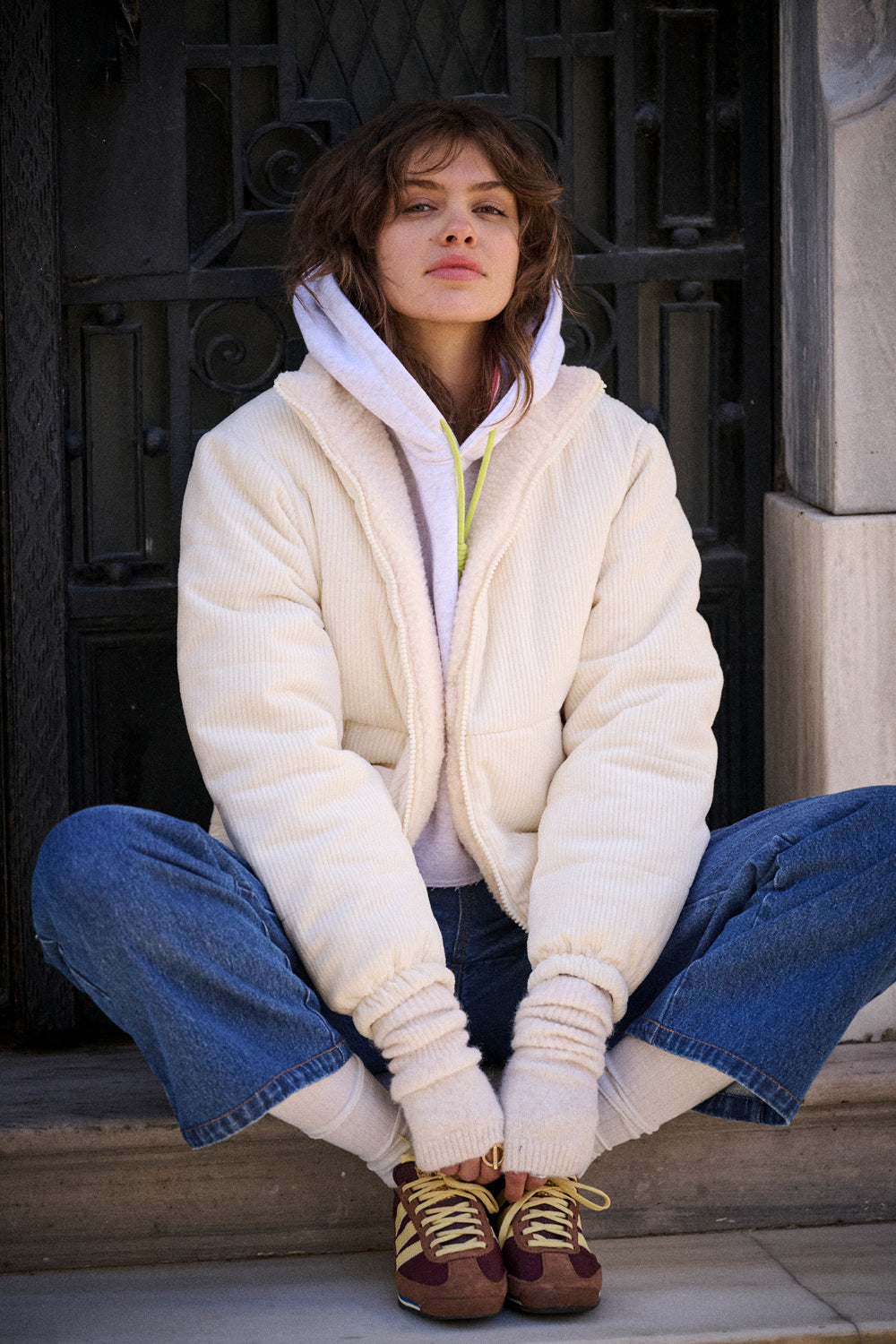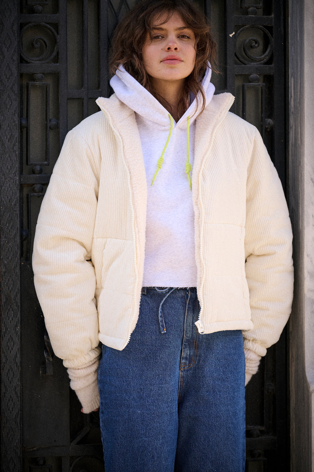En velours côtelé, elle capte la lumière et apporte tout de suite une touche de style. Entièrement doublée en polaire, elle enveloppe sans perdre en légèreté. Son cordon intérieur permet d’ajuster la ligne, les poches zippées gardent les mains au chaud et le tout dans un volume juste, facile à vivre, à enfiler, à aimer.