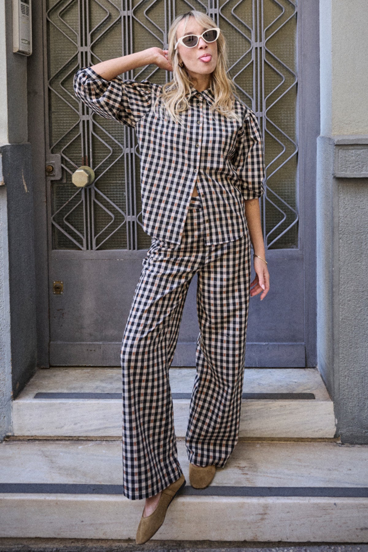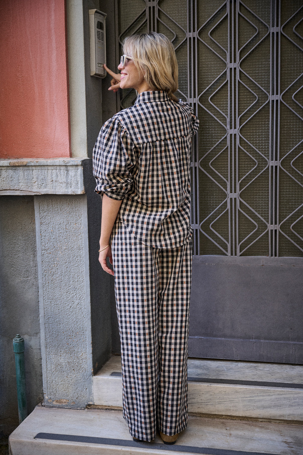 Sur les photos, Berta porte l'ensemble Eliott vichy brodé composé du pantalon Pali et de la chemise Catane vichy brodé assortie.