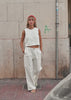 Un crop top à la coupe droite et légèrement raccourcie, qui structure le haut du corps, associé à un pantalon fluide et confortable qui accompagne chaque mouvement.