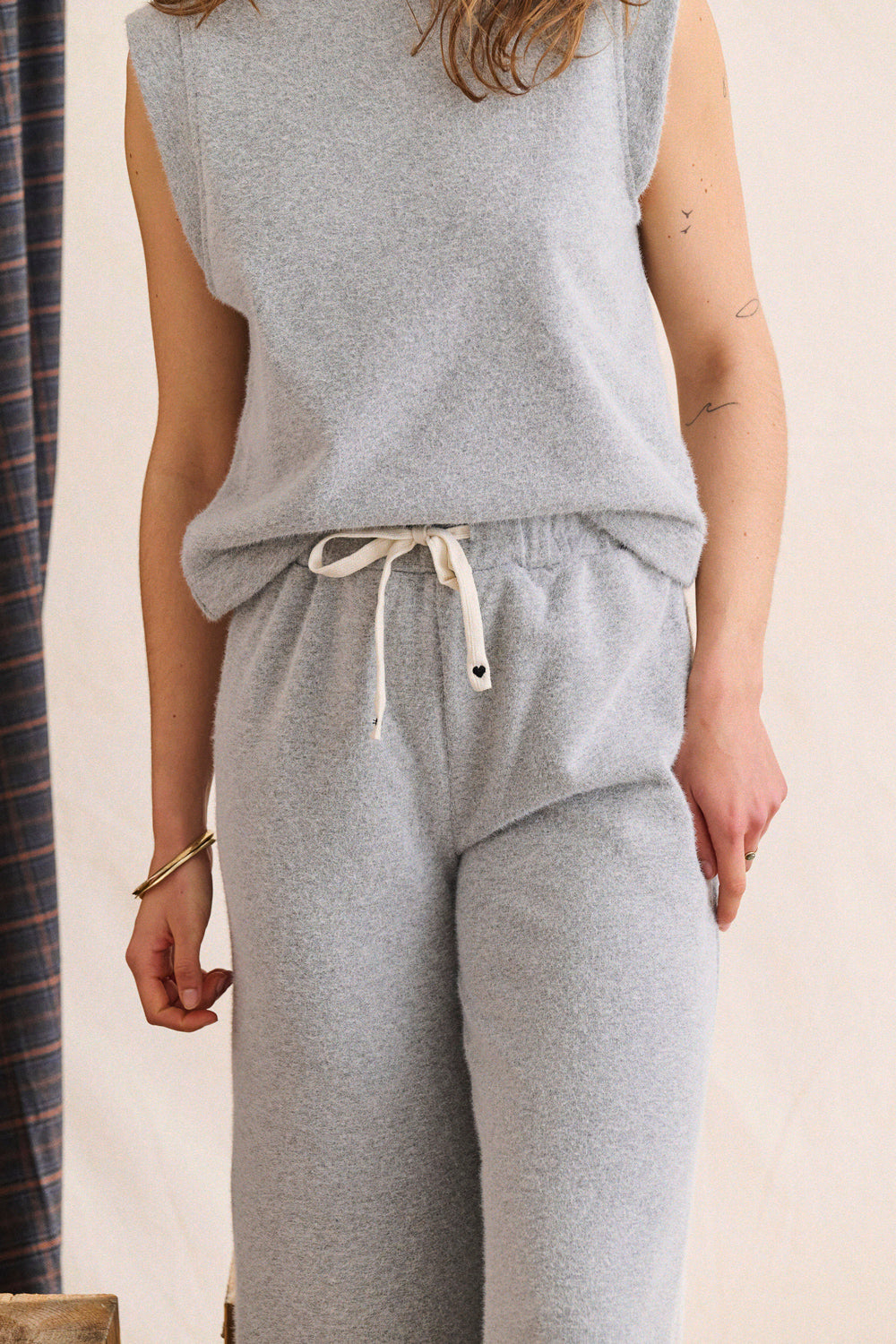 Le débardeur Nelia à la fois souple et structuré aux épaules s'associe au pantalon Peppa élastiqué à la taille et à la jambe légèrement évasée, pour notre plus grand bonheur dès qu'on rentre chez soi. Et ce jersey fluffy au toucher moelleux, réchauffe sans jamais étouffer. Parfait pour traîner avec style ou bosser depuis votre canapé.