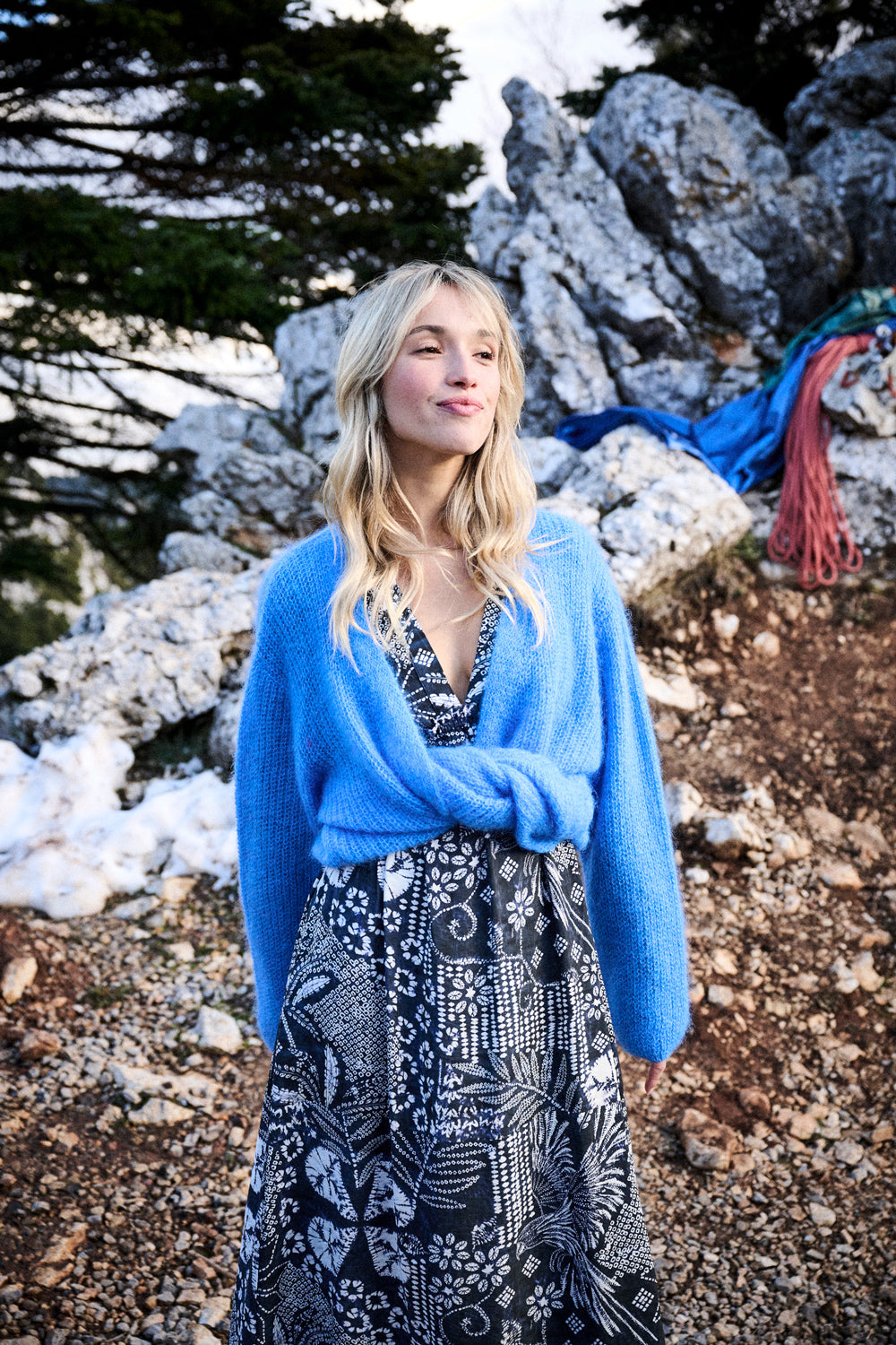 Ce gilet oversize en maille vaporeuse se glisse partout : sur un tee-shirt imprimé, un jean taille haute ou une robe légère. Sa coupe ample donne une allure cool et décontractée, et son bleu fait le reste, il illumine toutes les tenues.