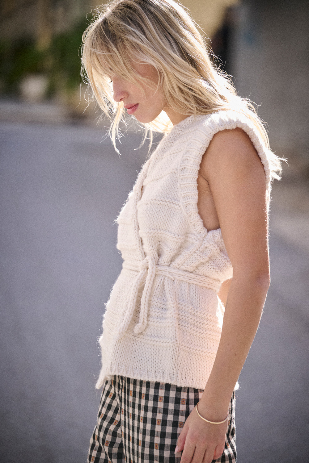 Sa coupe sans manches laisse de la place pour jouer : à même la peau ou par-dessus une chemise, ce gilet se croise sur le devant et se noue à la taille. Il est tricoté en grosses mailles irrégulières et mixe des jeux de points pour un rendu texturé, plein de relief.