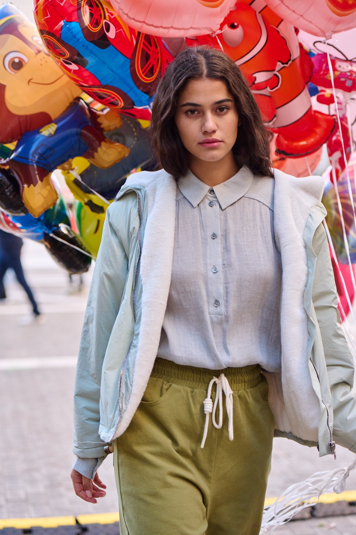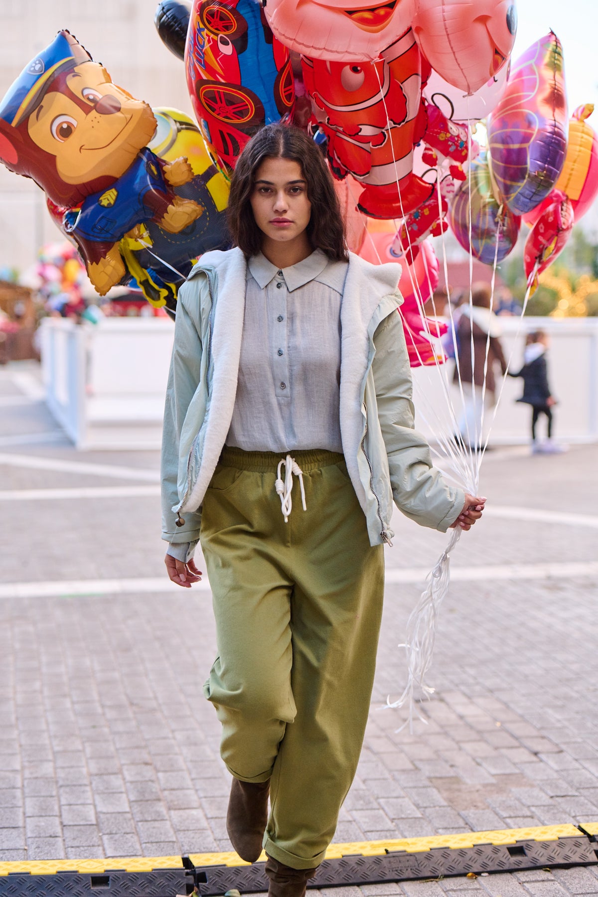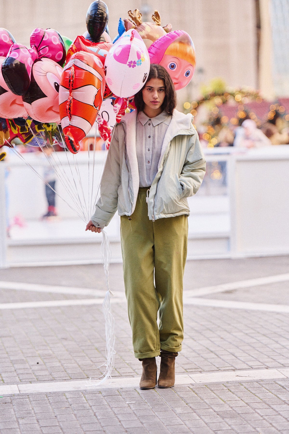 Elle porte la chemise Cassy gris chiné et le pantalon Primo vert olive