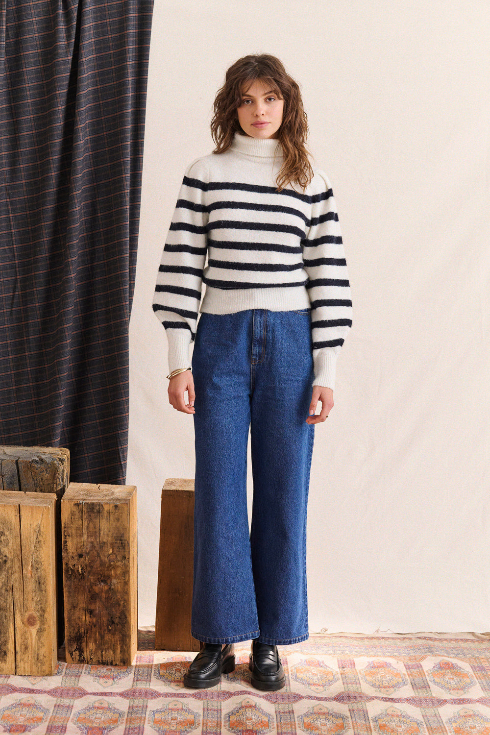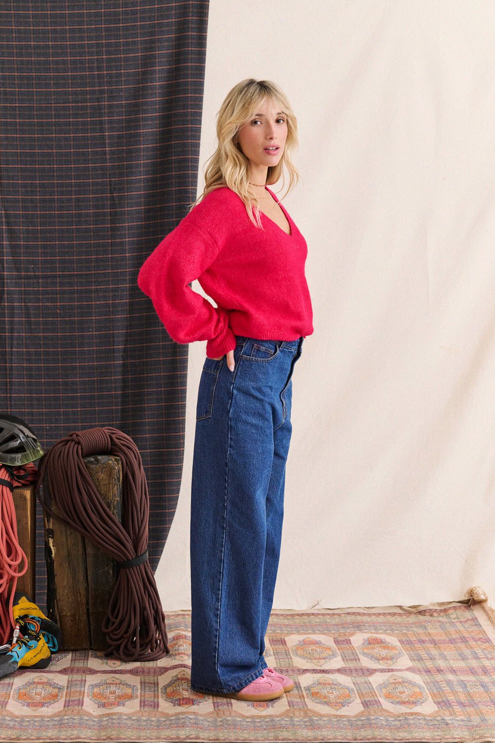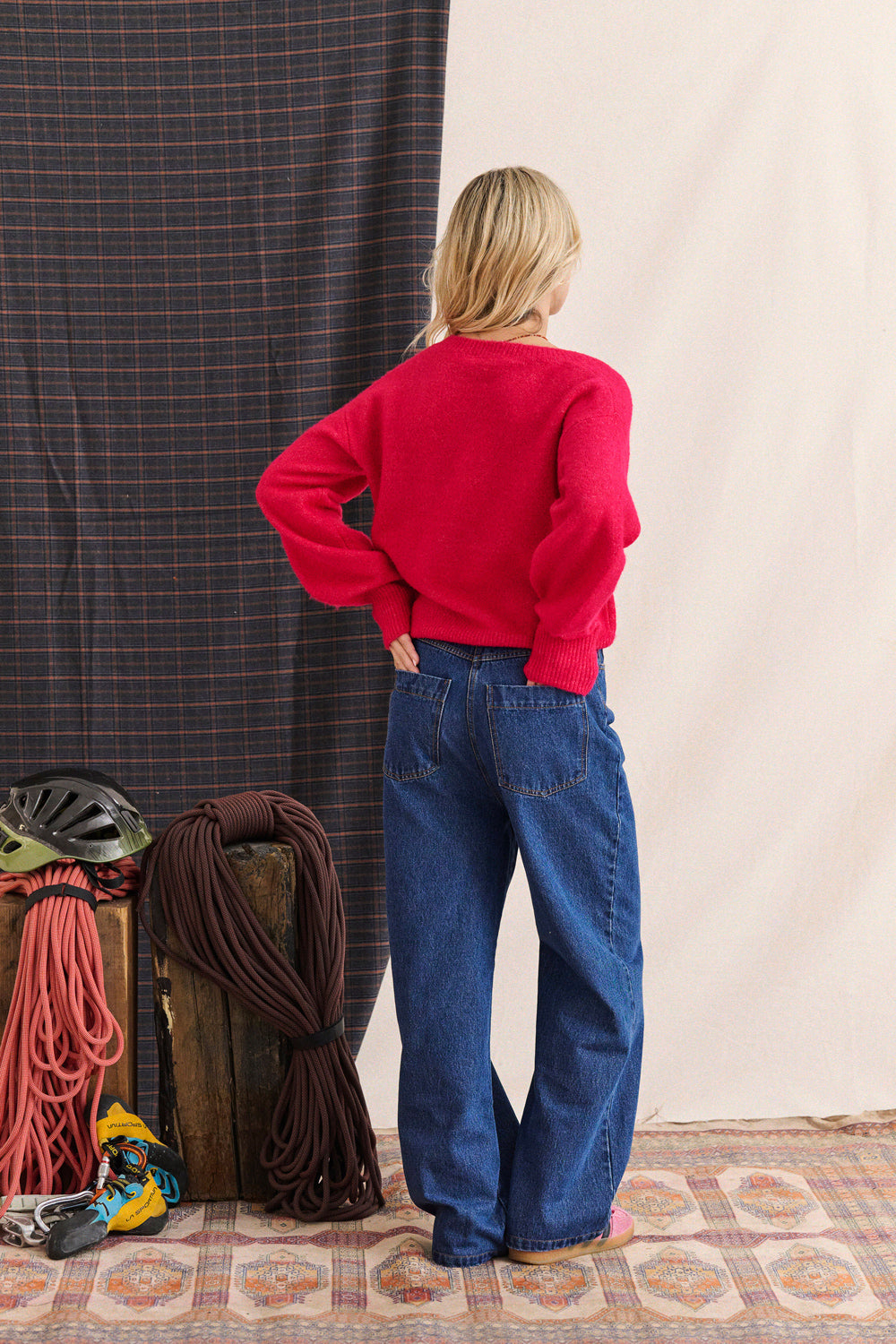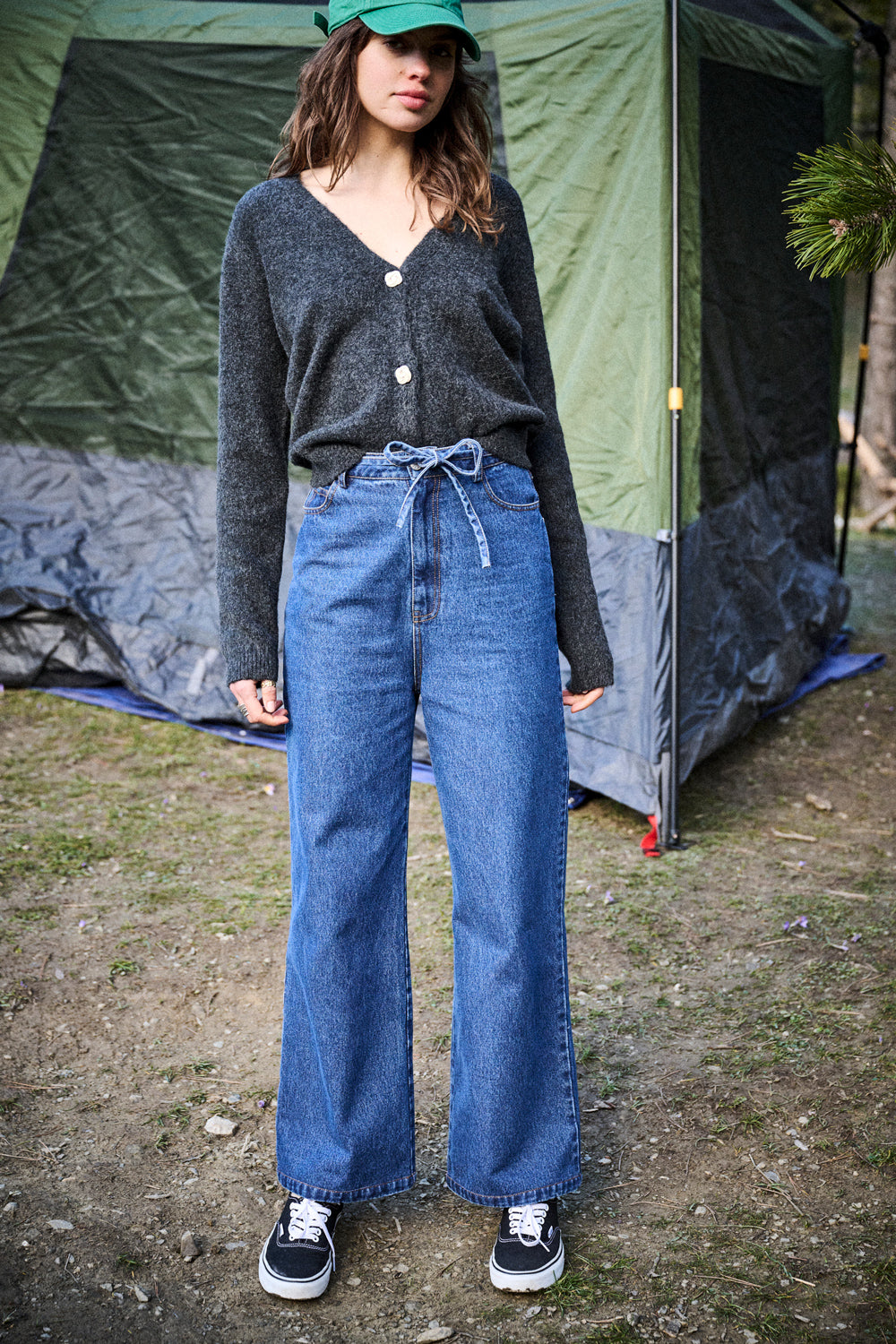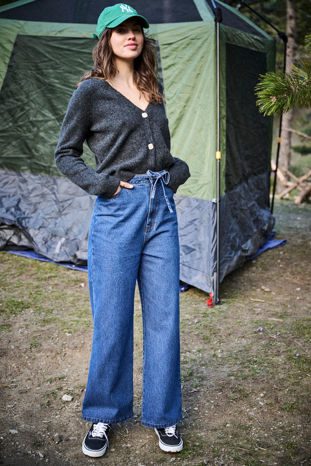 Taille haute, jambe droite un peu large, et ce denim brut qui va avec tout. Sa coupe allonge la silhouette sans en faire trop, et son tomber droit structure la jambe sans la serrer.