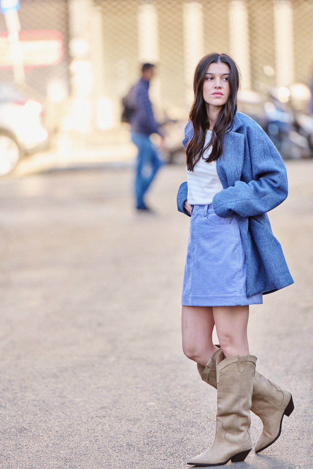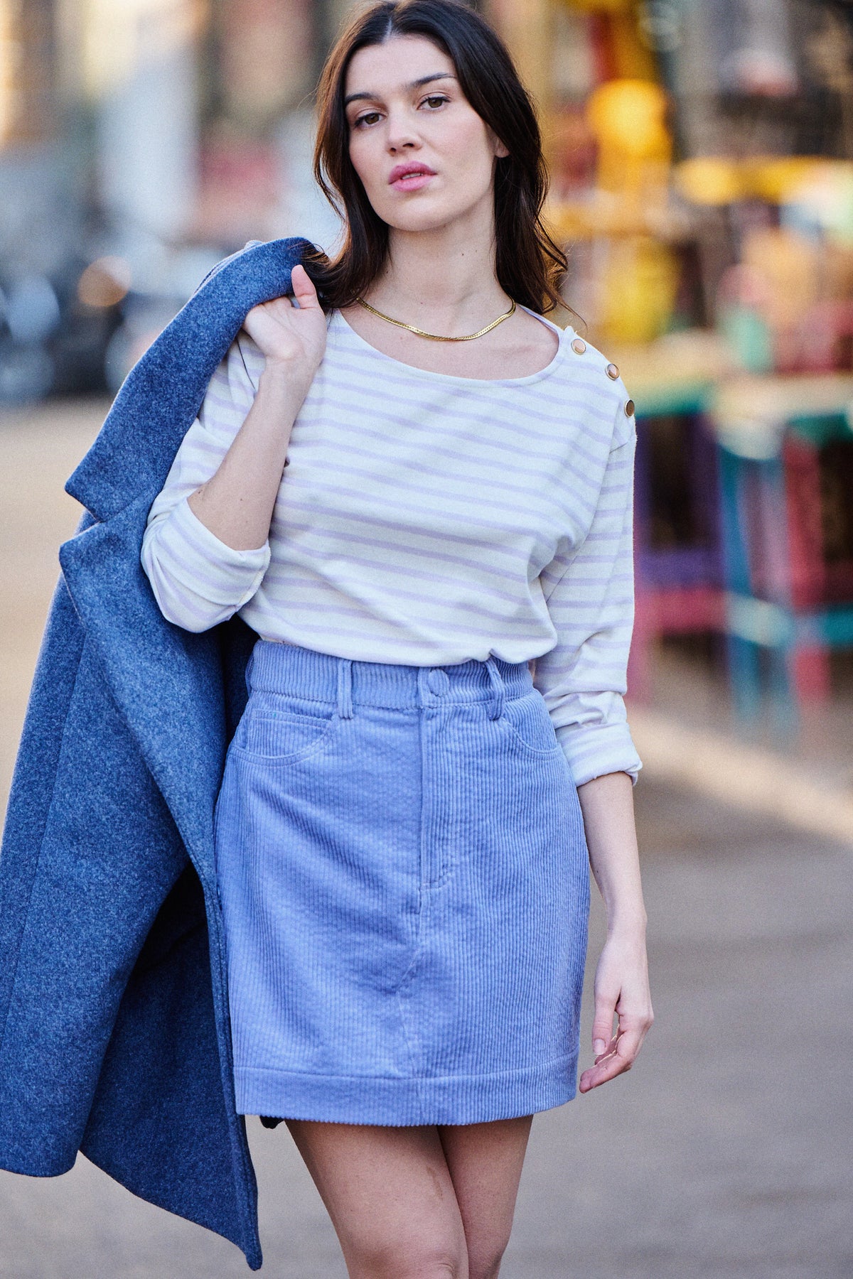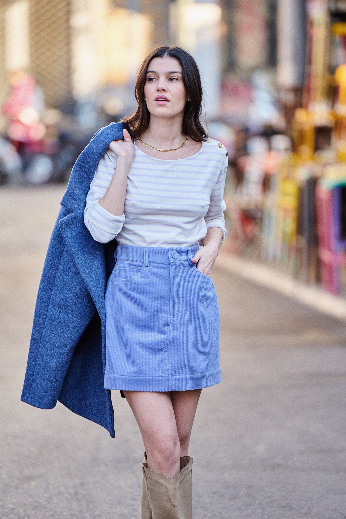 Une jupe en velours côtelé brut, courte mais pas trop, bien coupée et facile à vivre. Elle allonge la jambe, structure la silhouette, et matche avec tout (littéralement).