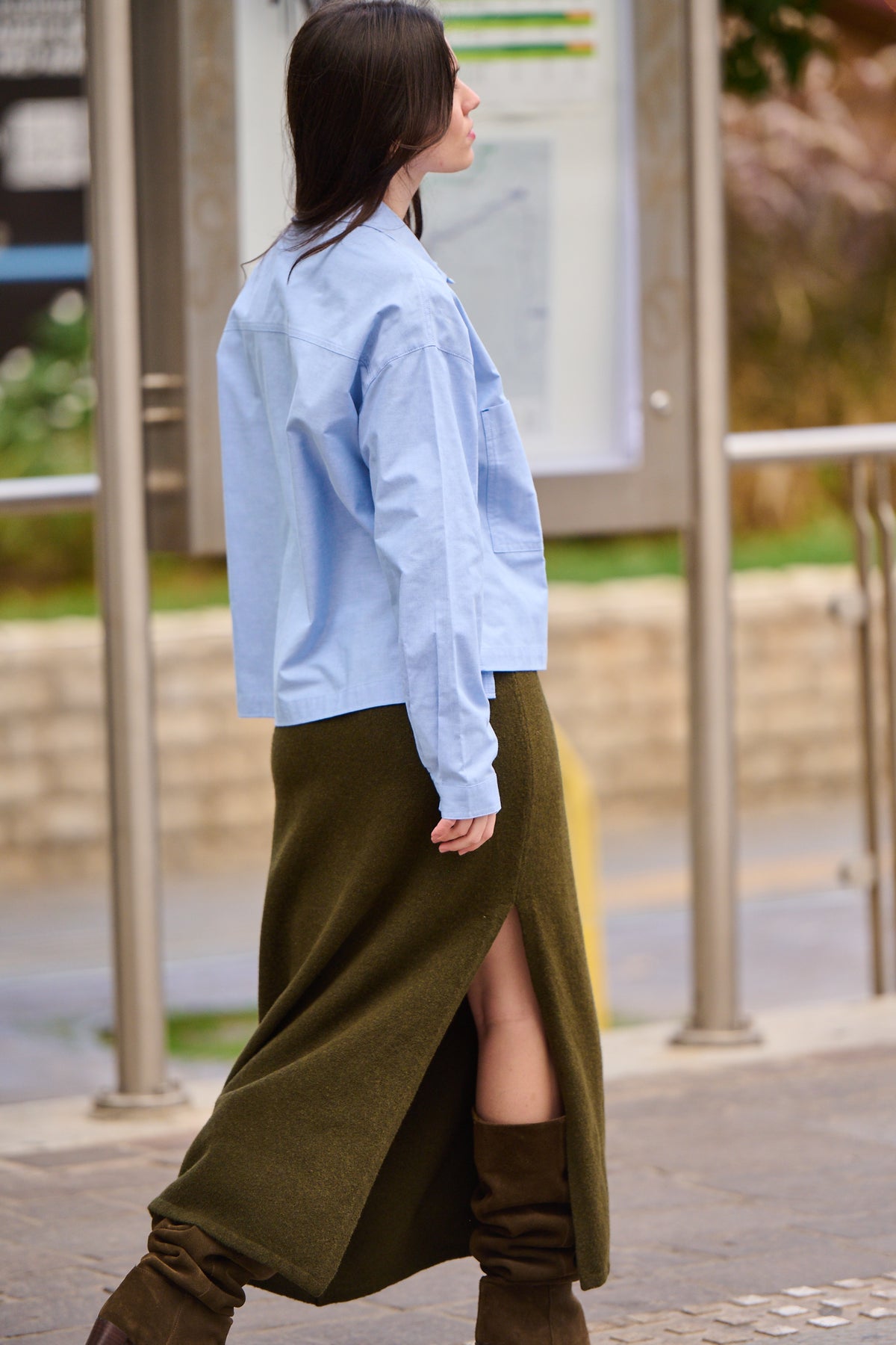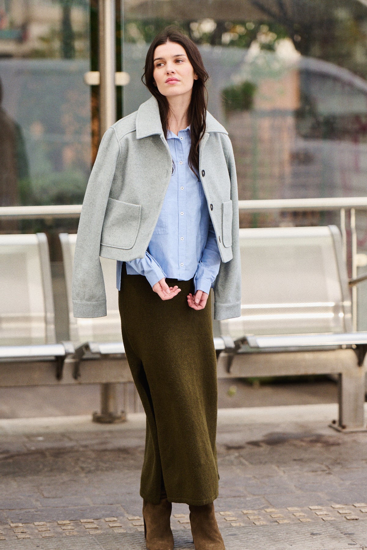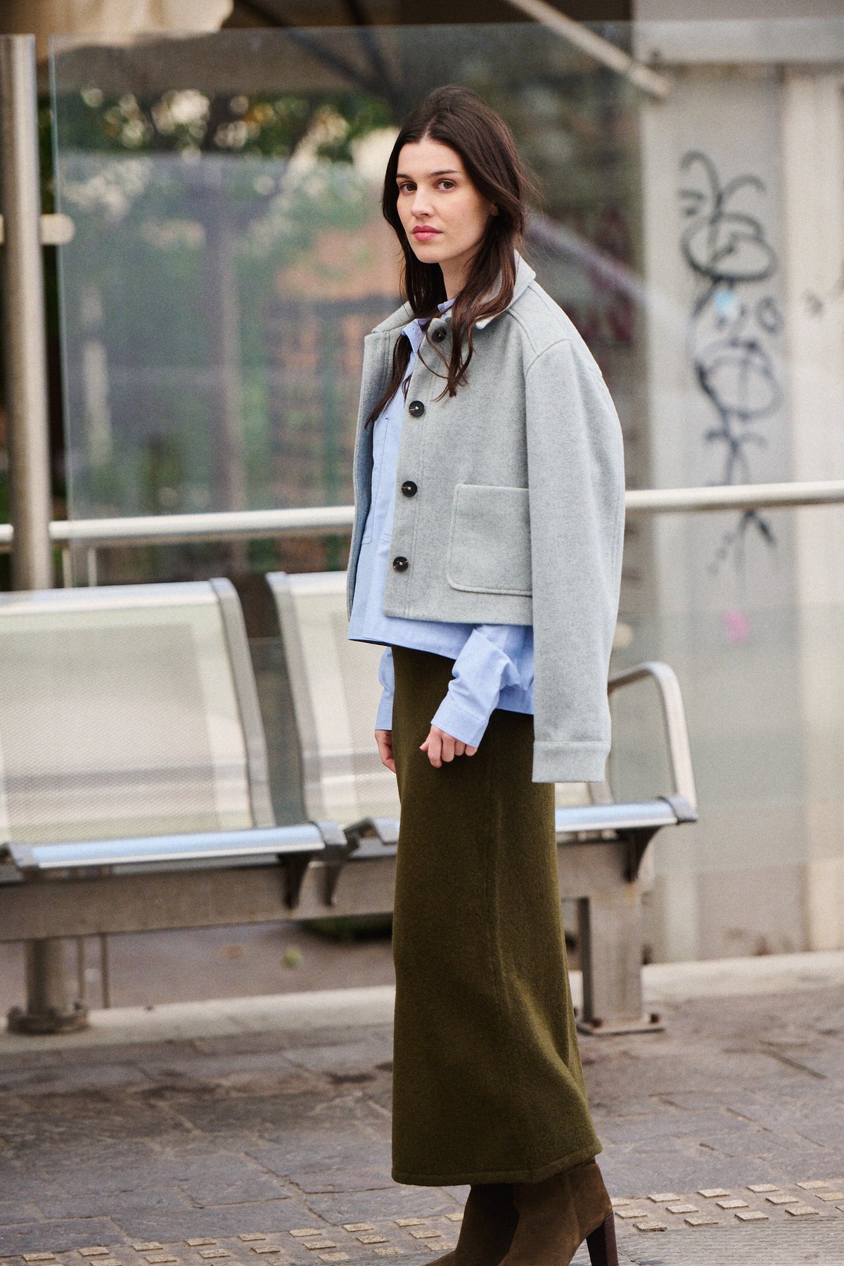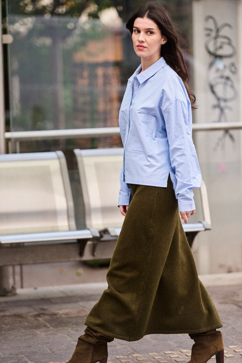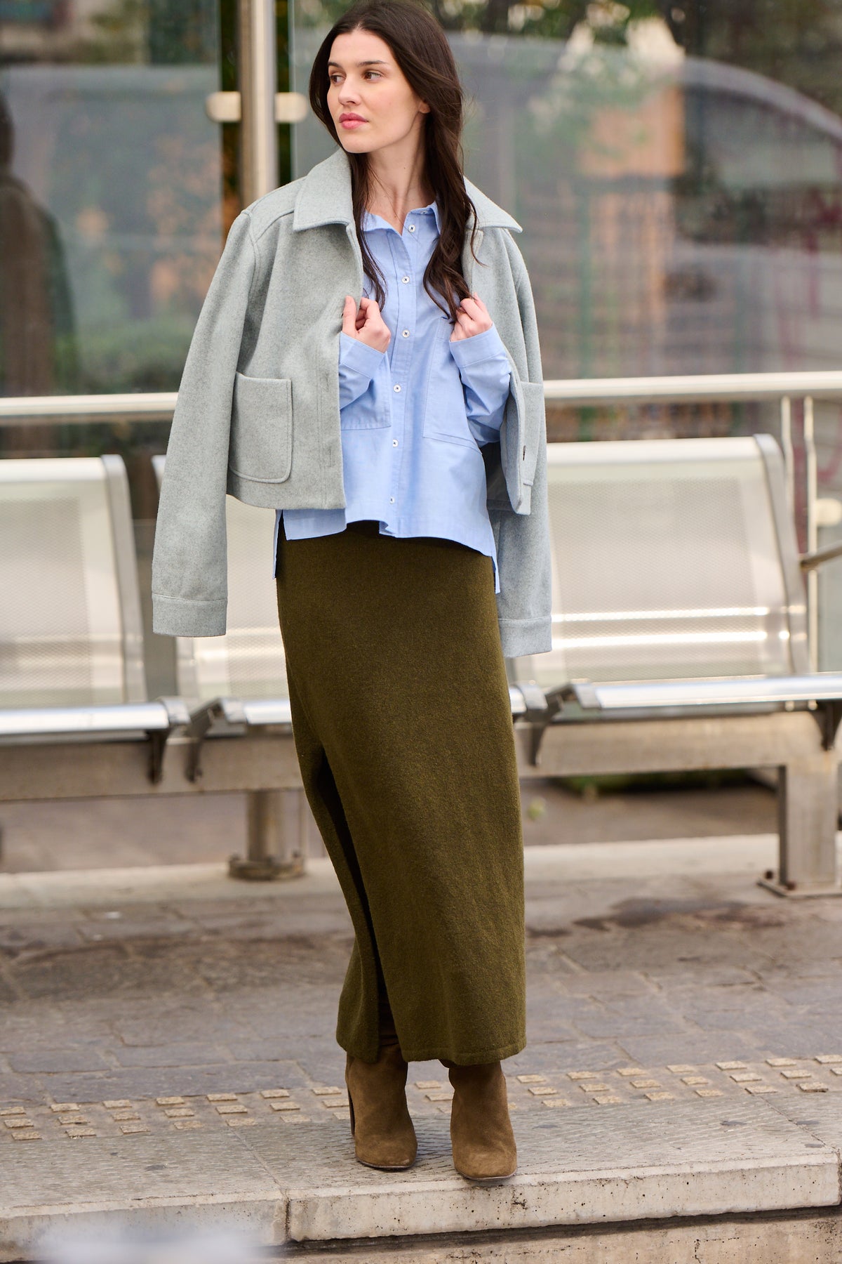 " La jupe Juno en maille est une pièce forte de l'hiver : elle est stylée avec sa fente d'un côté, mais aussi hyper enveloppante dans sa maille toute douce !! "