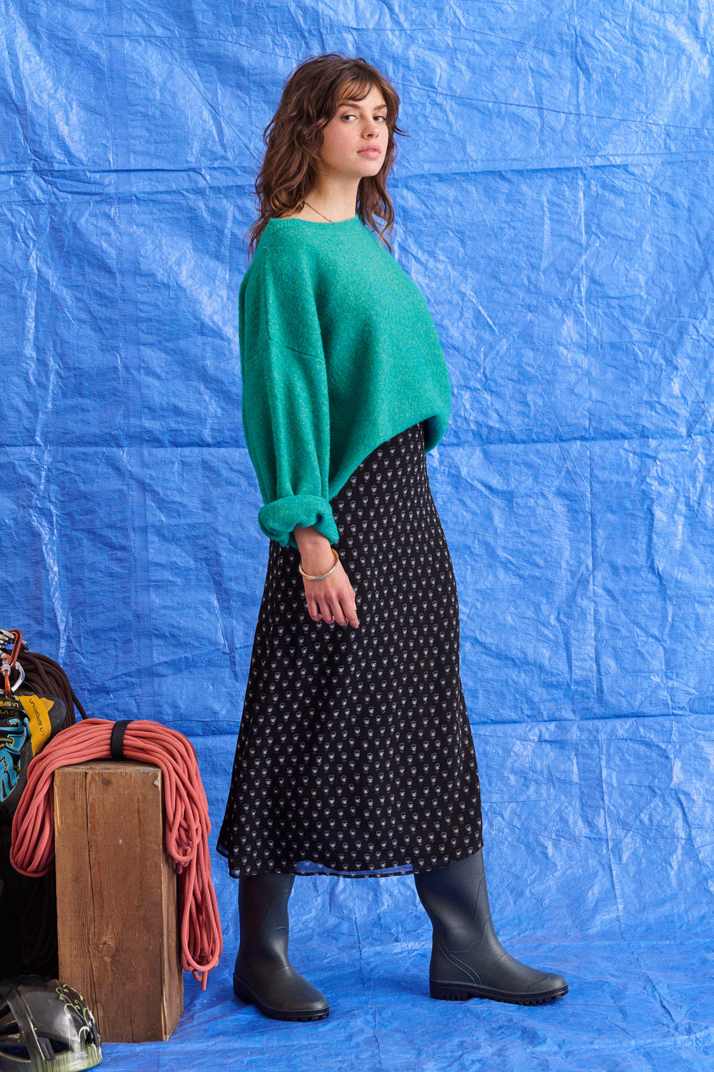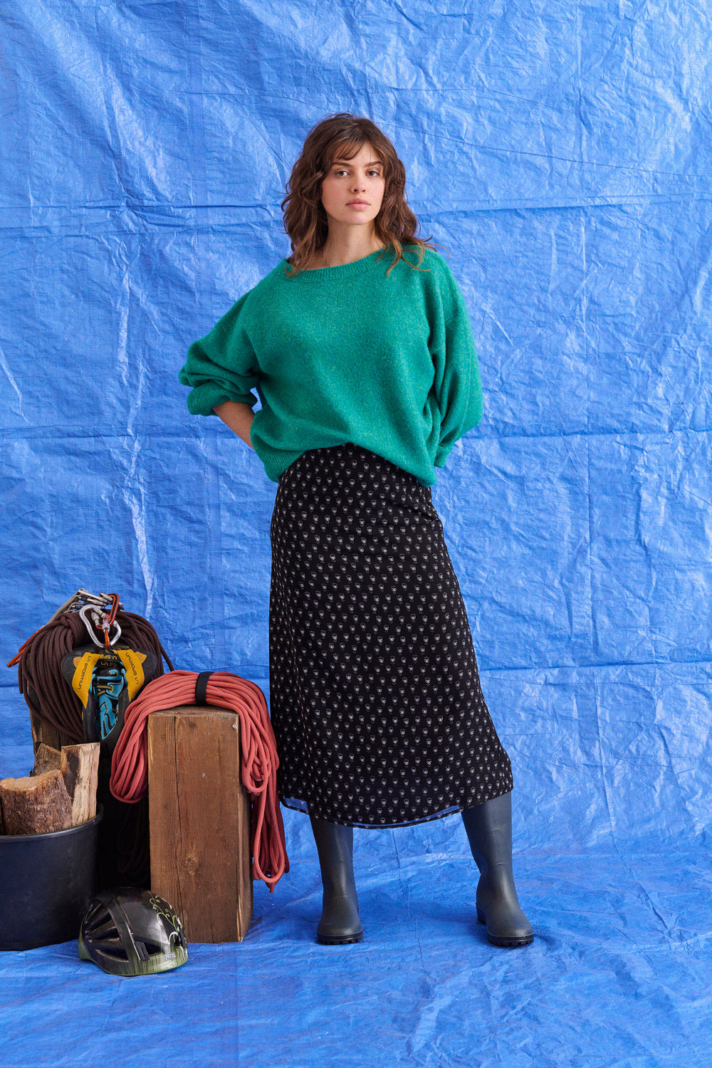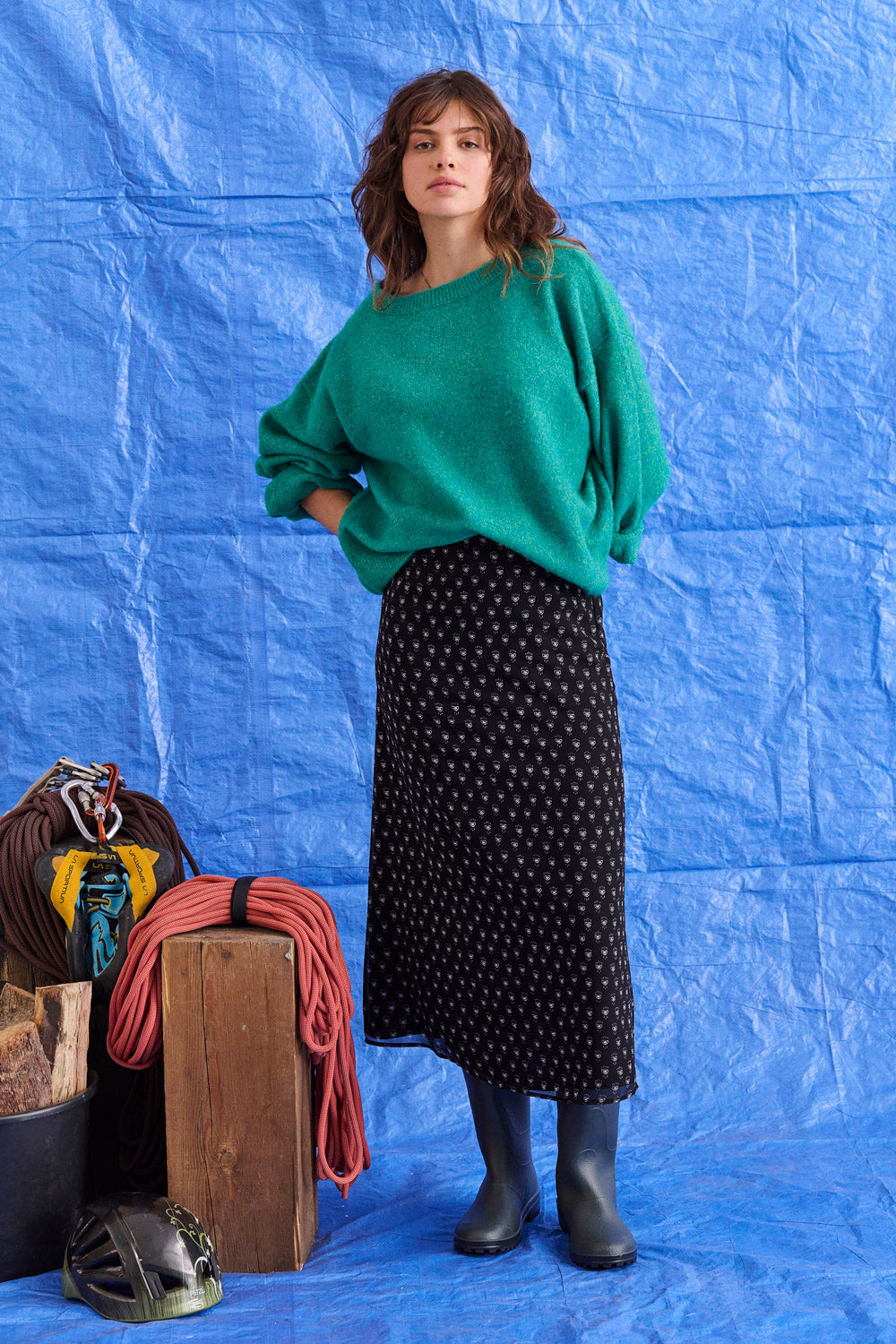 Coupe midi droite, tombé souple et léger, imprimé discret en all-over : elle s’adapte à tout. Avec un gros pull et des bottes, elle prend un air cool pour l’hiver.