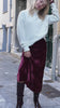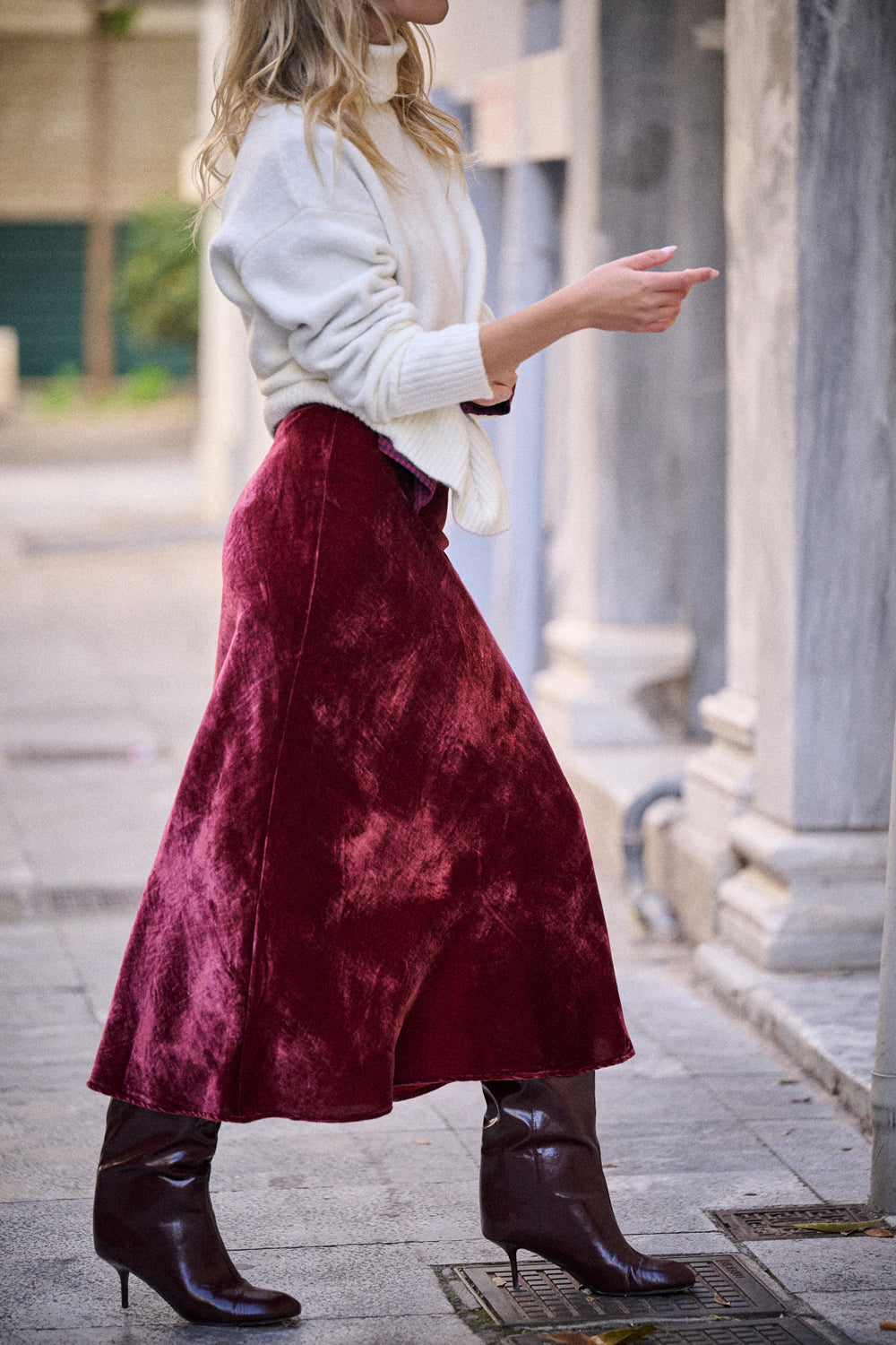 Son velours dense joue avec les reflets, sa coupe midi allonge la silhouette tout en gardant un mouvement souple et libre. Taille haute, elle se porte aussi bien avec un sweat qu'avec un pull en maille oversize, pour ce mélange de cool et de beau qu’on adore chez Laure+Max.
