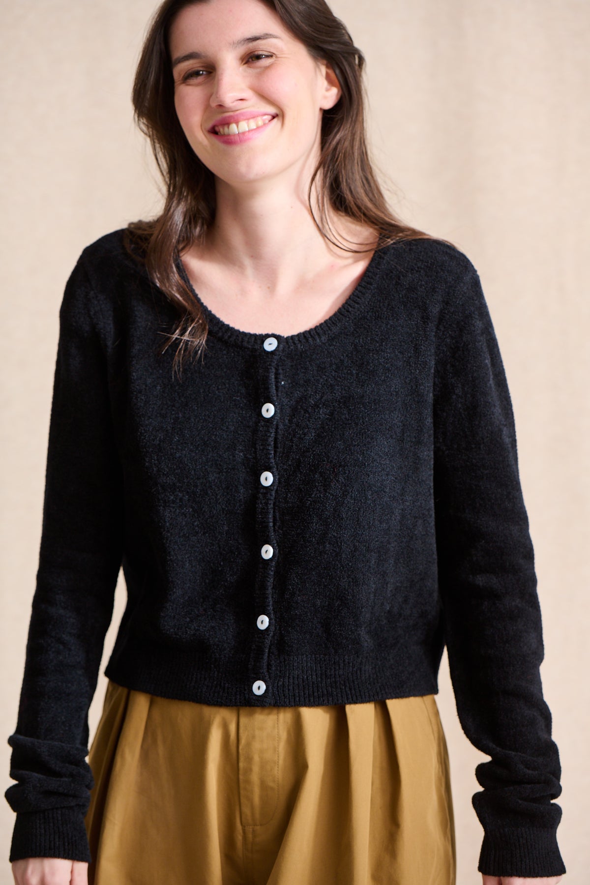 " Le gilet Lino, avec ses boutons petits boutons délicats, se porte comme un pull. En mode fermé comme un pull, ou ouvert sur un t-shirt ou une chemise, il est facile à assortir avec toute votre garde-robe. "
