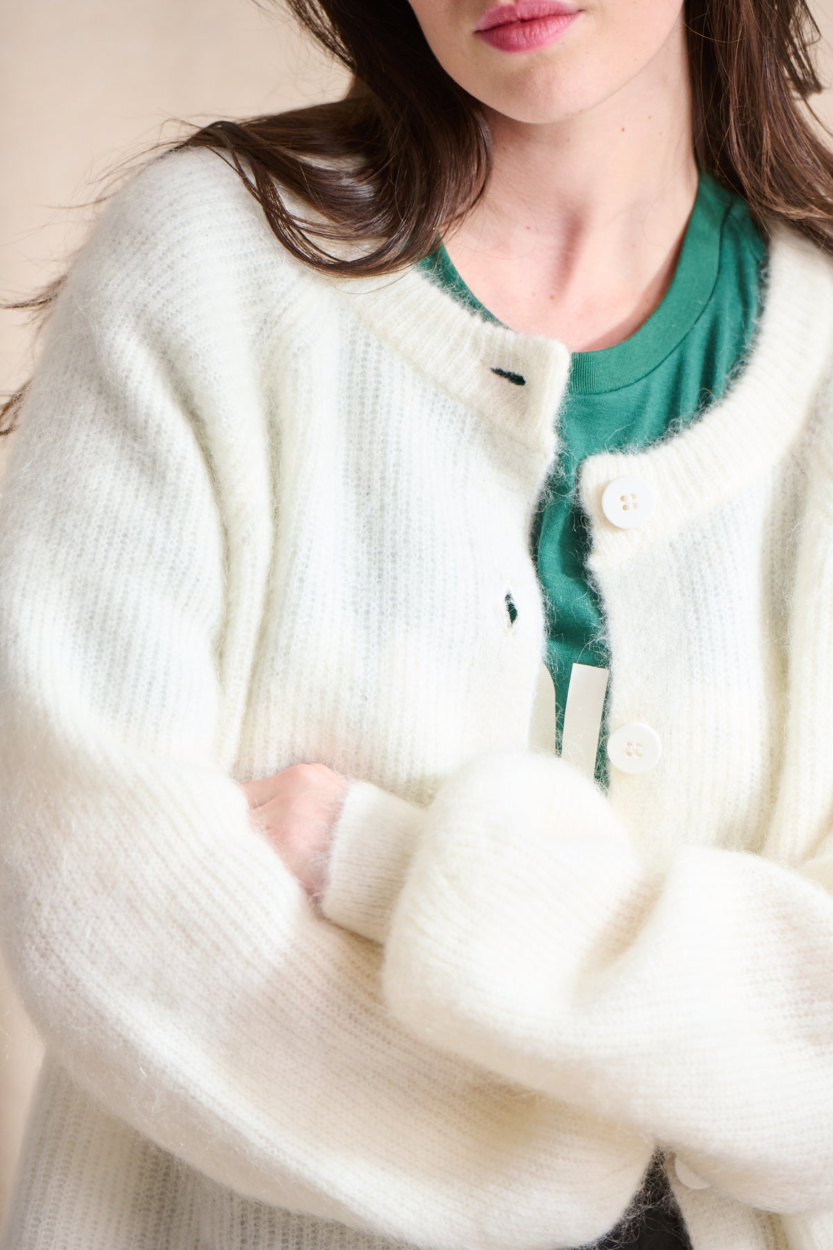 Ce gilet en maille douce joue à fond la carte du style : oversize juste ce qu’il faut et une coupe pensée pour se retourner. Porté boutonné devant ou dans le dos, il change de vibe sans jamais perdre en allure.