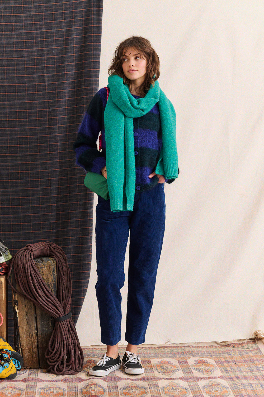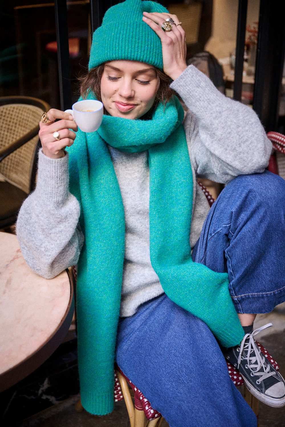 Deux essentiels à attraper en sortant, aussi doux qu’indispensables : l’écharpe, avec sa maille généreuse et souple, qu’on enroule sans y penser et qui apporte la juste dose de chaleur. Portée autour du cou ou posée sur les épaules, elle ajoute tout de suite ce mix de confort et d’allure qu’on aime quand les températures chutent.
