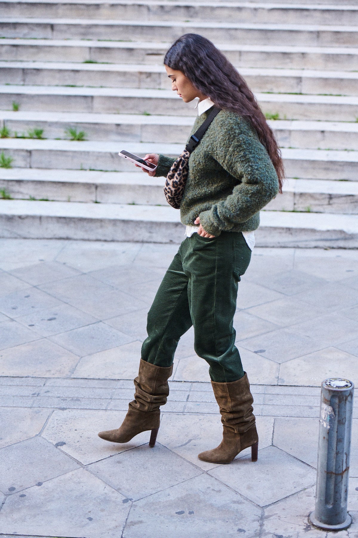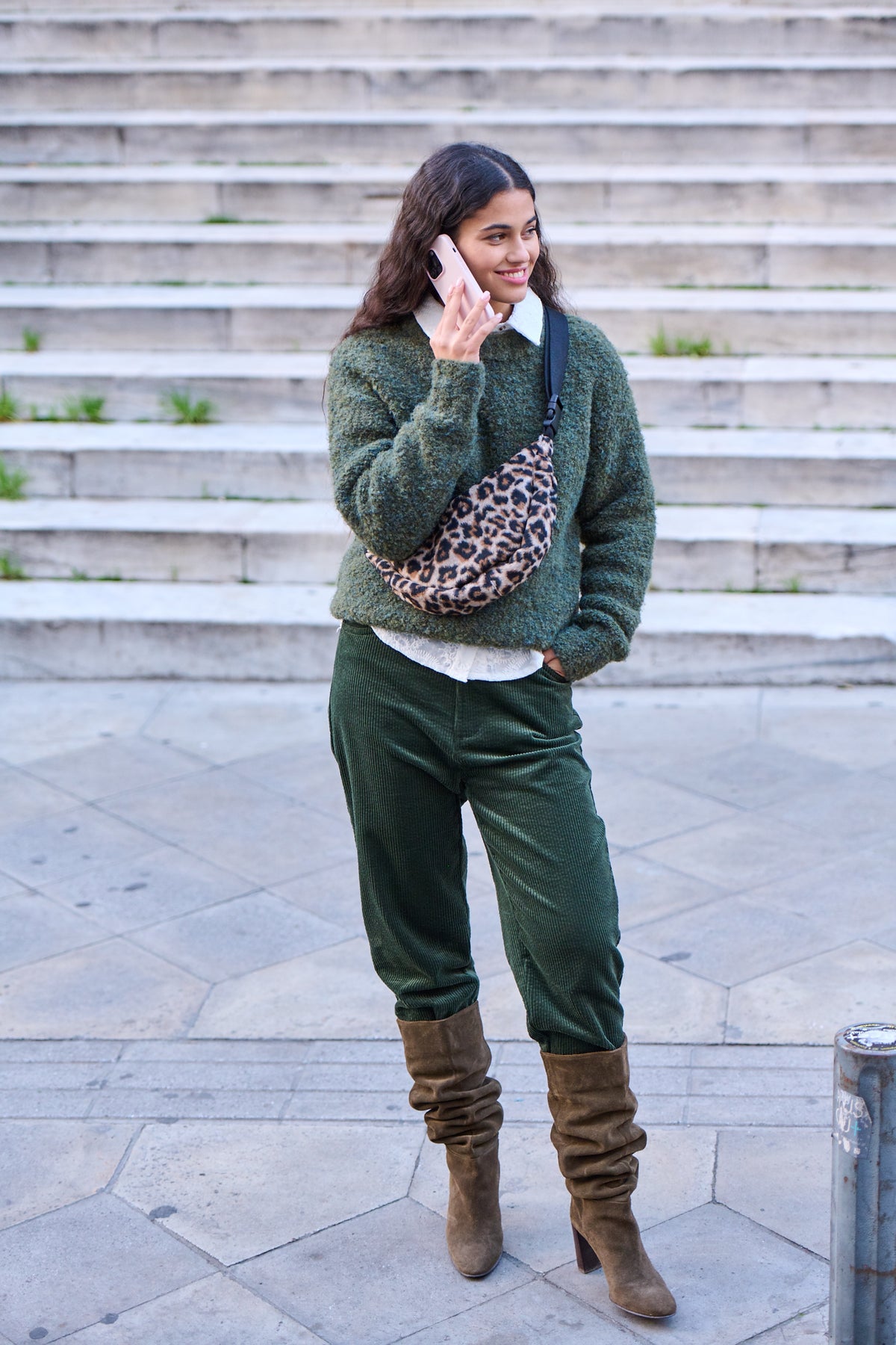 Elle porte le pantalon en velours côtelé Pino kaki, la chemise brodée Catane blanche et la banane léopard Alban