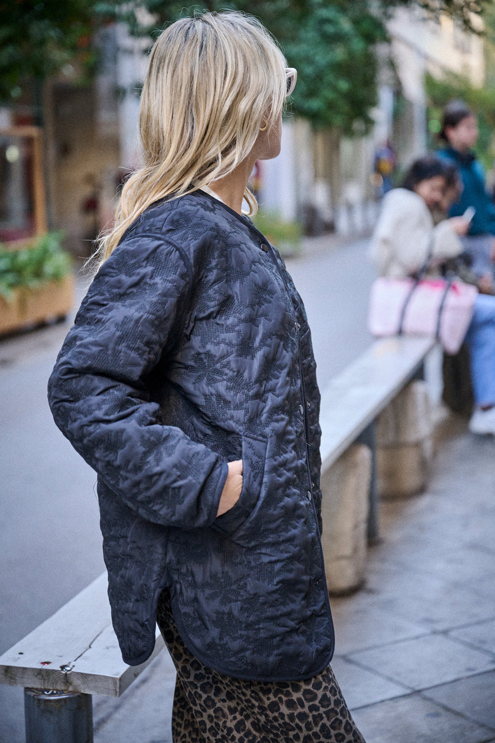 Un volume oversize juste comme il faut, une matière gaufrée matelassée avec des motifs en ton sur ton et un kaki profond facile à associer.