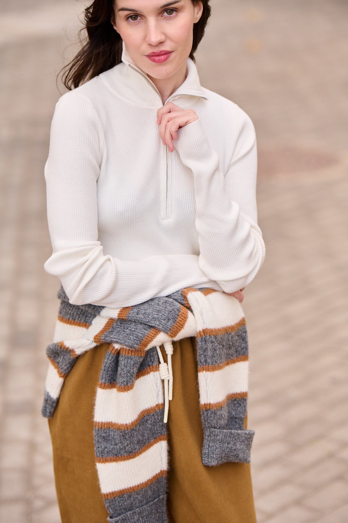 Elle porte le pull à rayures Melina et le pantalon Primo camel.